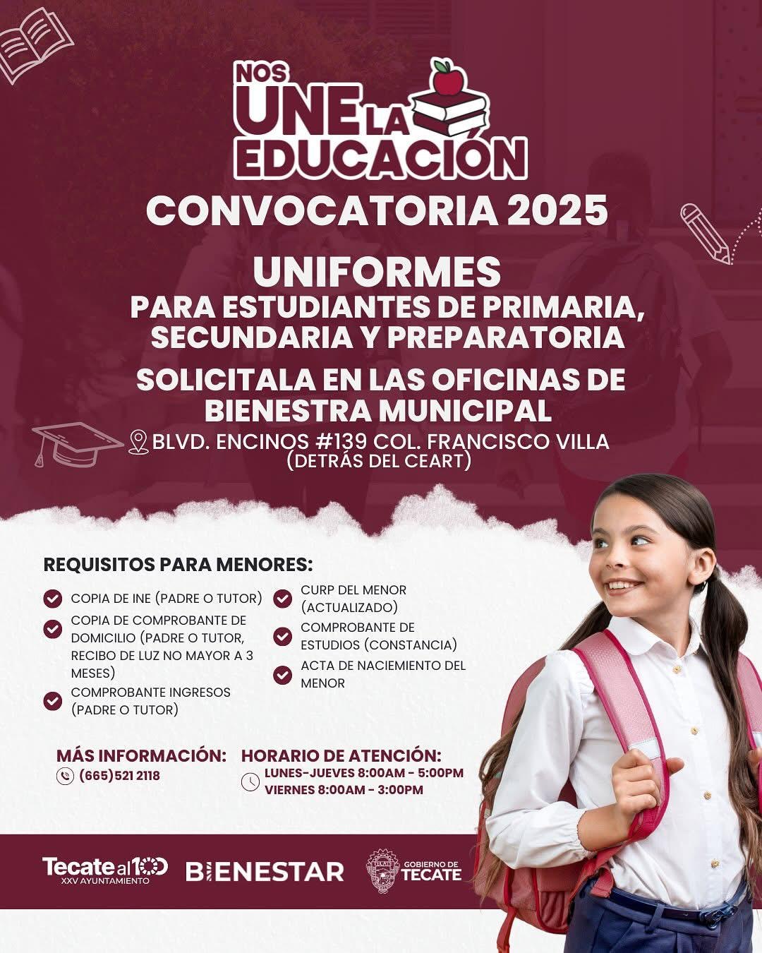 - El Gobierno de Tecate, a través de la Dirección de Bienestar Municipal, anuncia la apertura de las convocatorias 2025 del programa “Nos Une la Educación”, con el objetivo de apoyar a las familias tecatenses en el nuevo ciclo escolar.