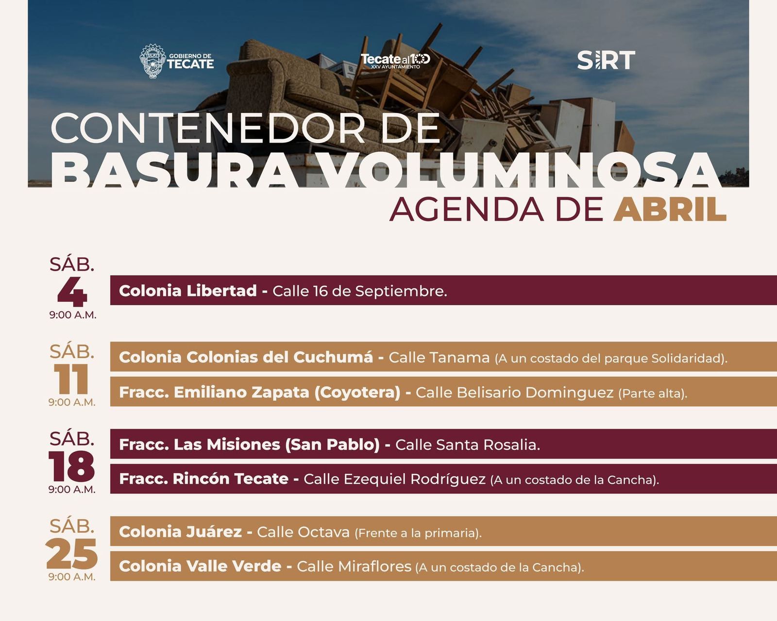 • Gobierno de Tecate anuncia calendario de abril del programa “Contenedor de Basura Voluminosa” 2 abril, 2026