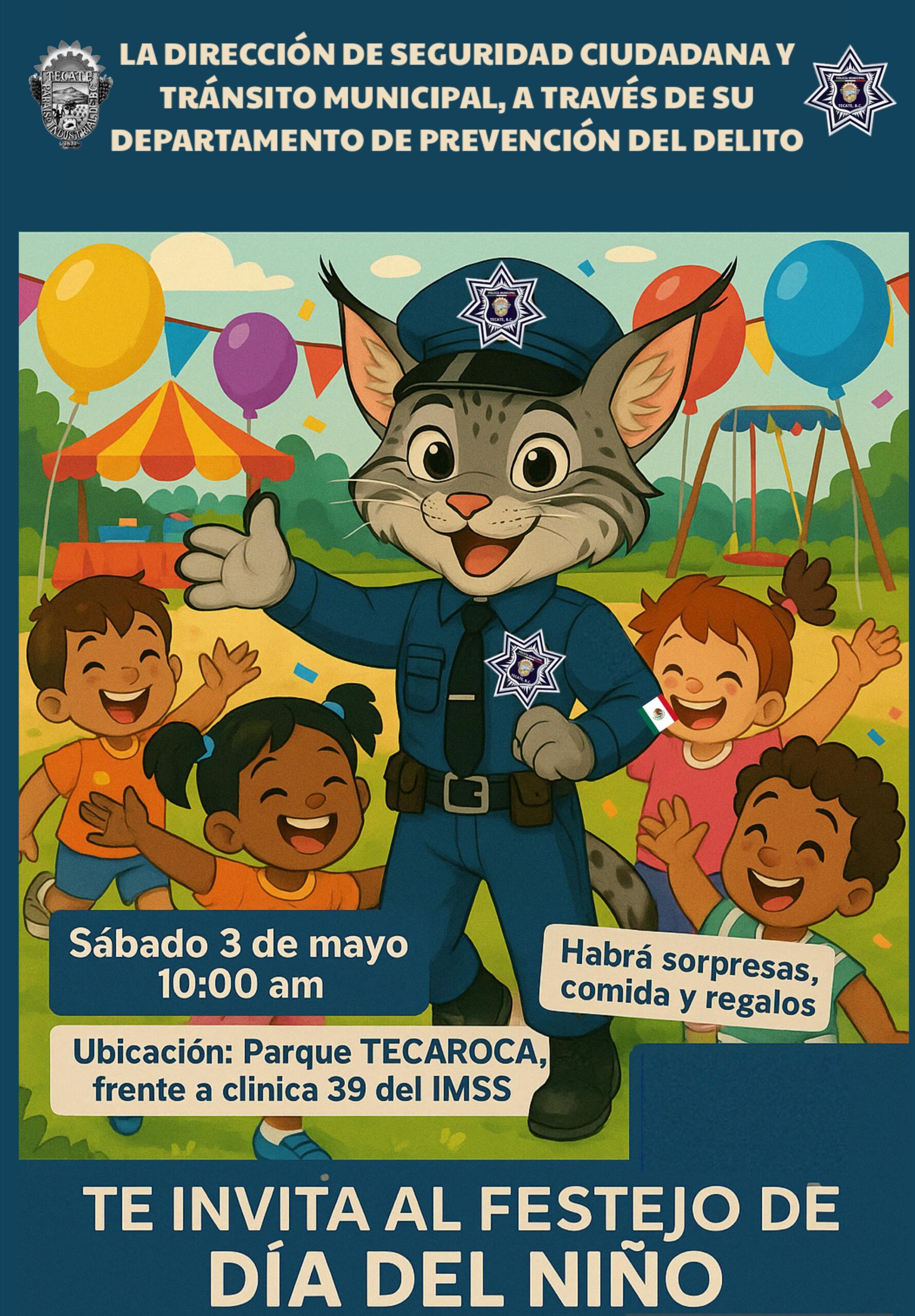 - La Dirección de Seguridad Ciudadana y Tránsito Municipal, a través de su Departamento de Prevención del Delito, tiene el honor de invitar a todas las niñas, niños y sus familias al gran festejo del Día del Niño, que se llevará a cabo el próximo sábado 3 de mayo a partir de las 10:00 de la mañana, en el Parque Tecaroca, ubicado frente a la clínica 39 del IMSS.