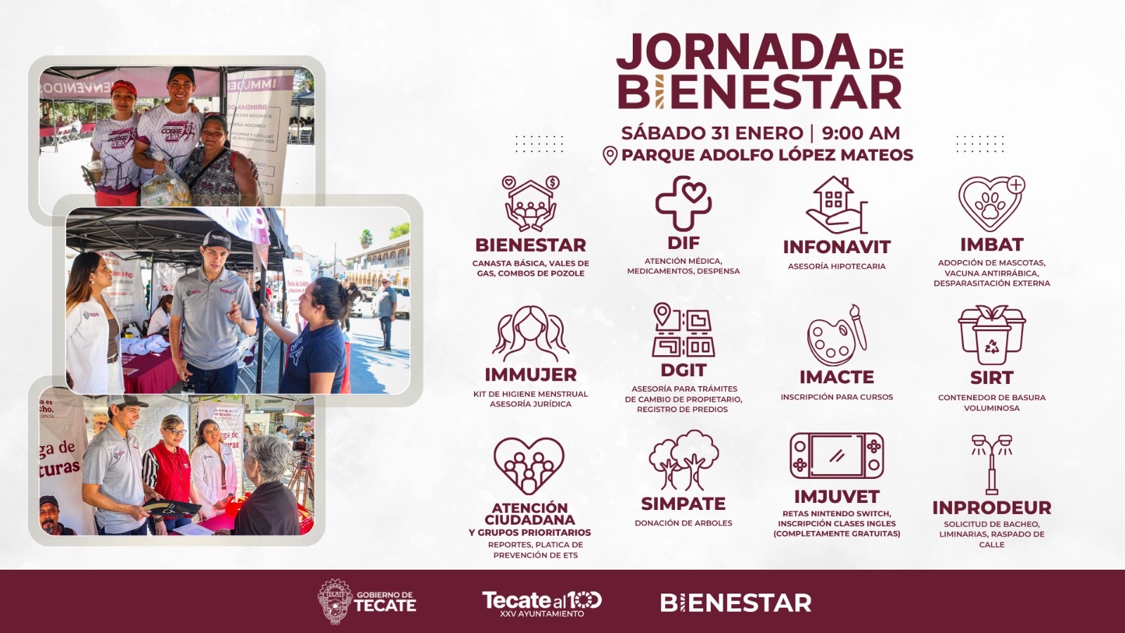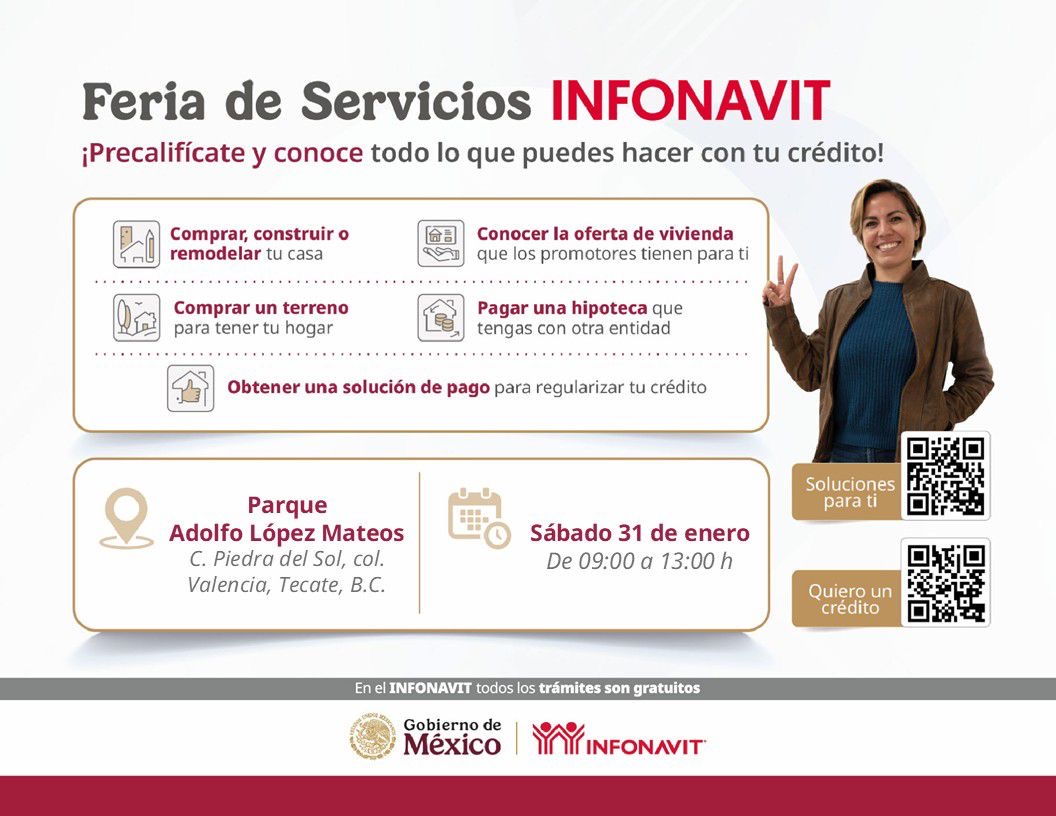 • En el marco de la Jornada de Bienestar que se realizará este sábado 31 de enero, en el Parque Adolfo López Mateos, el Gobierno de Tecate informa que se contará con la participación de un módulo del Instituto del Fondo Nacional de la Vivienda para los Trabajadores (INFONAVIT), con el objetivo de acercar servicios y asesoría directa a las y los trabajadores del municipio.