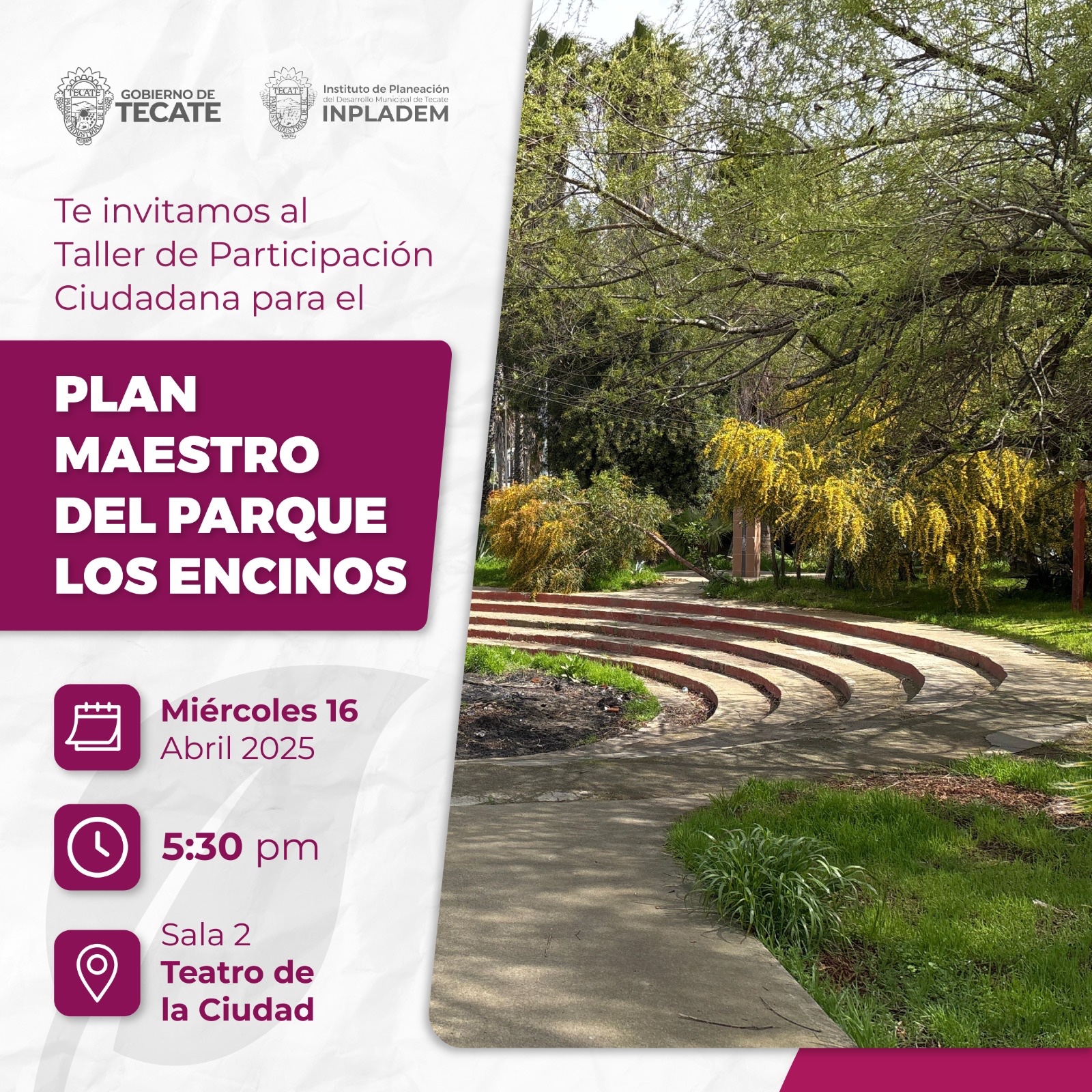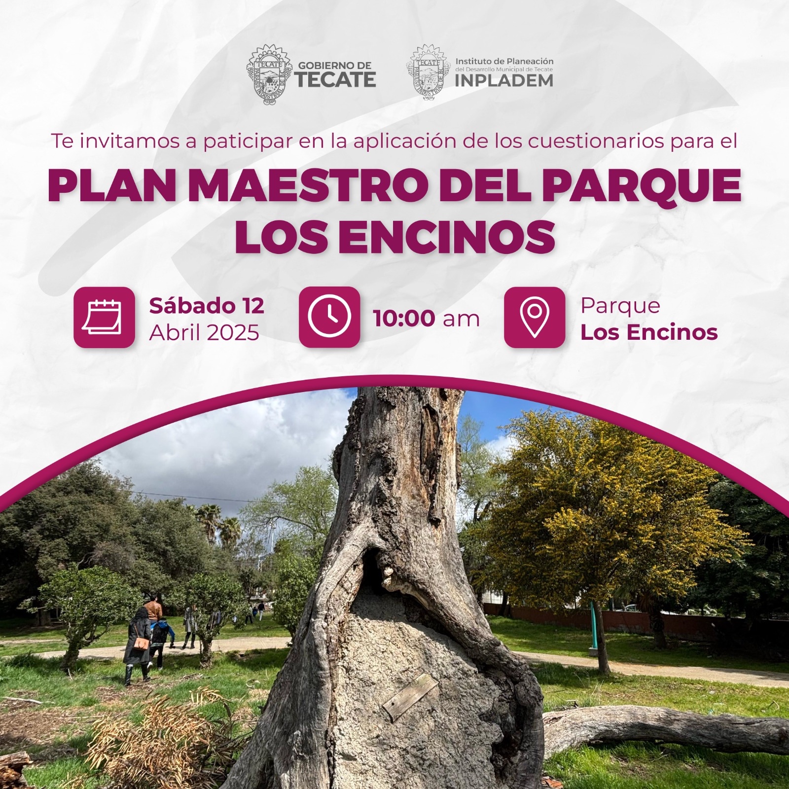 El Gobierno Municipal de Tecate, a través del Instituto de Planeación del Desarrollo Municipal (INPLADEM), continúa promoviendo la participación ciudadana como eje fundamental para la mejora de los espacios públicos. En esta ocasión, invita a la comunidad a participar activamente en el desarrollo del Plan Maestro del Parque Los Encinos, mediante dos importantes actividades que se llevarán a cabo este mes de abril.