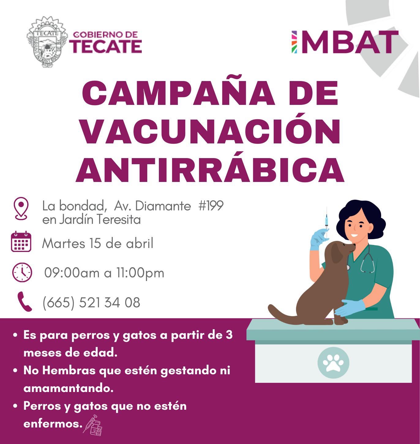 Proteger a las mascotas es un acto de amor y responsabilidad, por ello el Gobierno Municipal de Tecate, a través del Instituto Municipal de Bienestar Animal de Tecate (IMBAT), invita a la comunidad a participar en la Campaña de Vacunación Antirrábica, que se llevará a cabo el próximo martes 15 de abril en Jardín Teresita, Av. Diamante #199, colonia La Bondad, en un horario de 09:00 de la mañana a 11:00 de la noche.