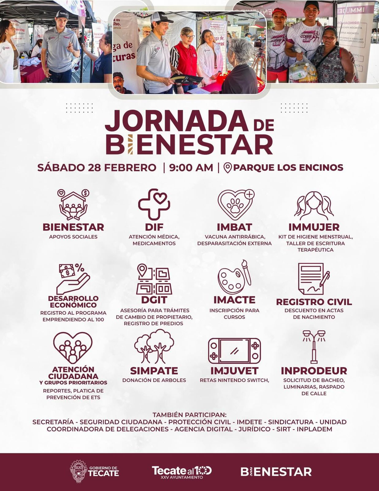 - Con el objetivo de acercar servicios y programas municipales a las familias tecatenses, el Gobierno de Tecate llevará a cabo la “Jornada de Bienestar” este sábado 28 de febrero a partir de las 9:00 de la mañana en el Parque Los Encinos.