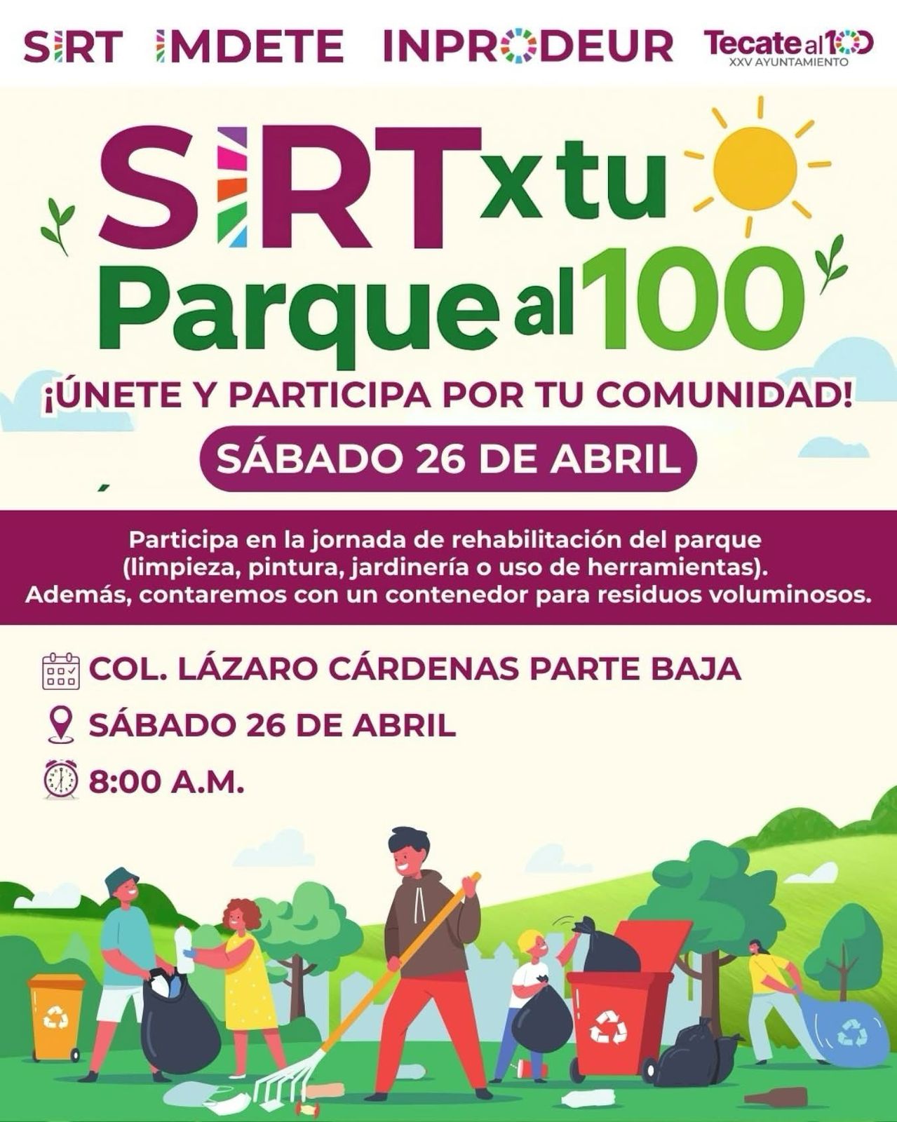 El Gobierno de Tecate, a través del programa de Servicios Integrales de Residuos (SIRT), en coordinación con IMDETE e INPRODEUR, invita a la comunidad a sumarse a la jornada “SIRT x tu Parque al 100”, una actividad dedicada a la recuperación y mantenimiento de espacios públicos.