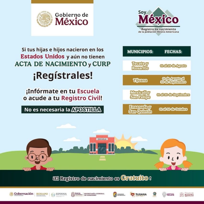 - El Gobierno de Tecate, a través de la Secretaría del Ayuntamiento, invita a las familias binacionales a aprovechar la campaña nacional “Soy México”, impulsada por el Gobierno Federal, que brinda la oportunidad de registrar de manera gratuita a niñas, niños y adolescentes nacidos en Estados Unidos de madres o padres mexicanos.
