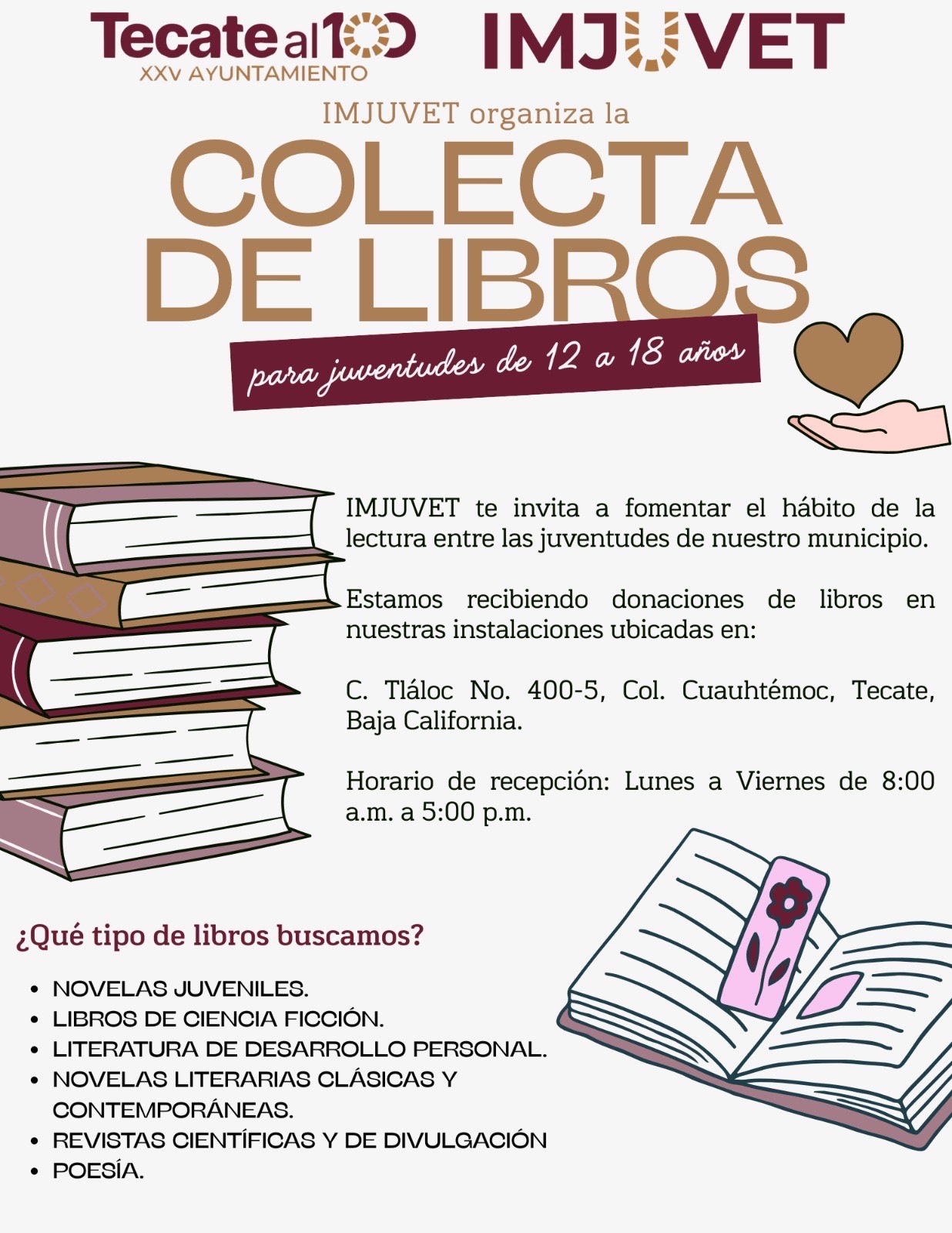 - Con el propósito de fomentar el hábito de la lectura entre las juventudes tecatenses, el Gobierno de Tecate, a través del Instituto Municipal de la Juventud (IMJUVET), lanza una invitación a la ciudadanía para sumarse a la Colecta de Libros para Jóvenes de 12 a 18 años, una iniciativa que busca despertar el interés por la literatura, el pensamiento crítico y la creatividad en las nuevas generaciones.