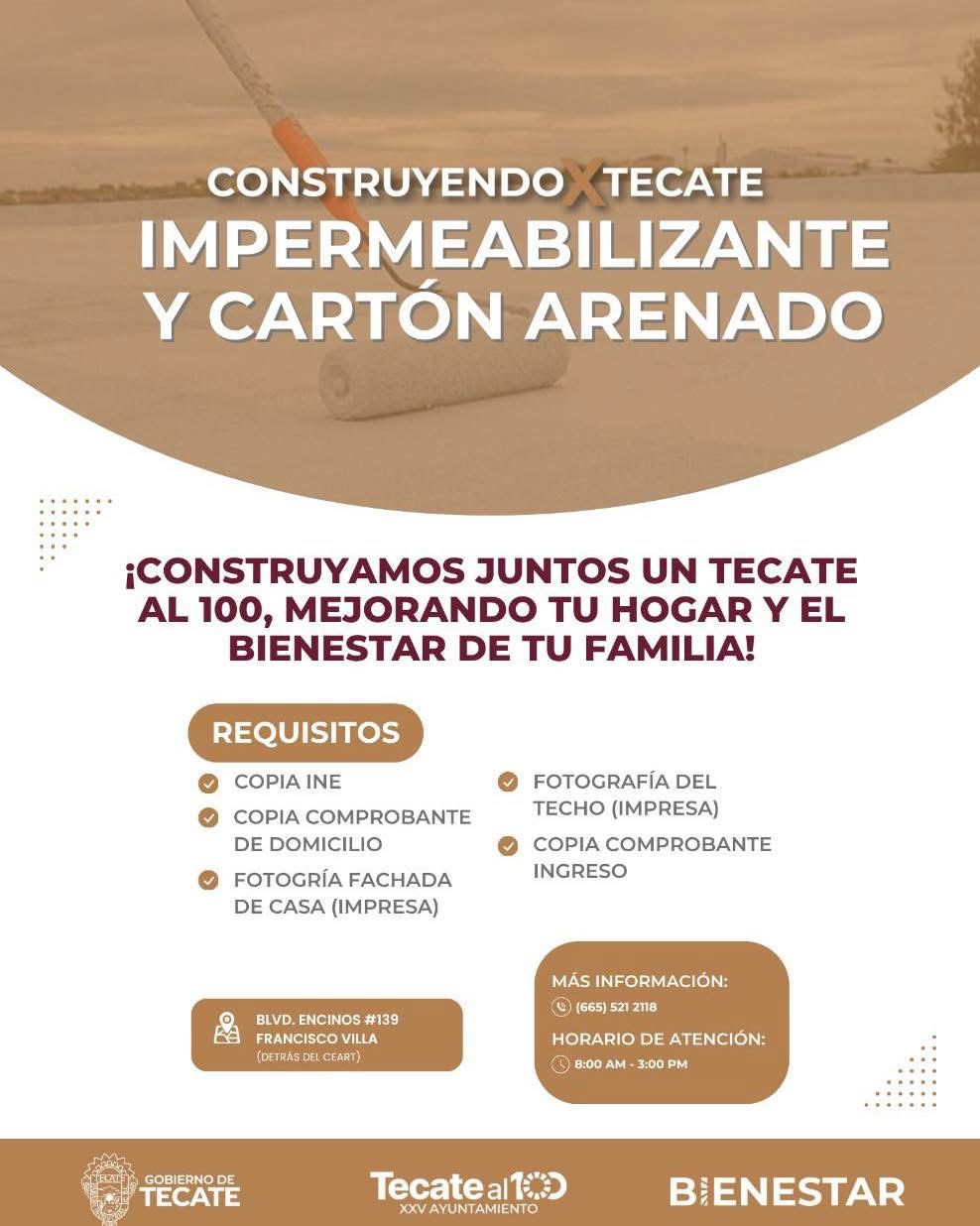 Con el objetivo de apoyar a las familias tecatenses en el cuidado y protección de sus hogares durante la temporada de clima extremo, el Gobierno de Tecate, a través de la Dirección de Bienestar Municipal, abrió la convocatoria del programa “Construyendo X Tecate”, mediante el cual se entregará impermeabilizante y cartón arenado a hogares que lo necesiten.