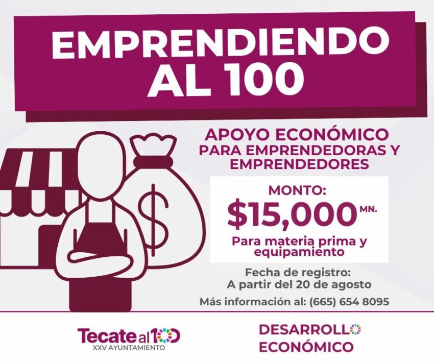 Con el objetivo de impulsar la economía local y respaldar a quienes inician o fortalecen sus proyectos productivos, el Gobierno de Tecate, a través de la Dirección de Desarrollo Económico, anunció la apertura de la convocatoria del programa “Emprendiendo al 100”, dirigido a emprendedoras y emprendedores del municipio.