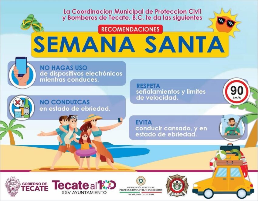 Con el objetivo de proteger la integridad de las familias tecatenses durante el periodo vacacional de Semana Santa, el Gobierno de Tecate, a través de la Coordinación Municipal de Protección Civil y Bomberos, hace un atento llamado a la ciudadanía a seguir una serie de recomendaciones básicas pero vitales para evitar incidentes y asegurar unas vacaciones tranquilas y sin contratiempos.