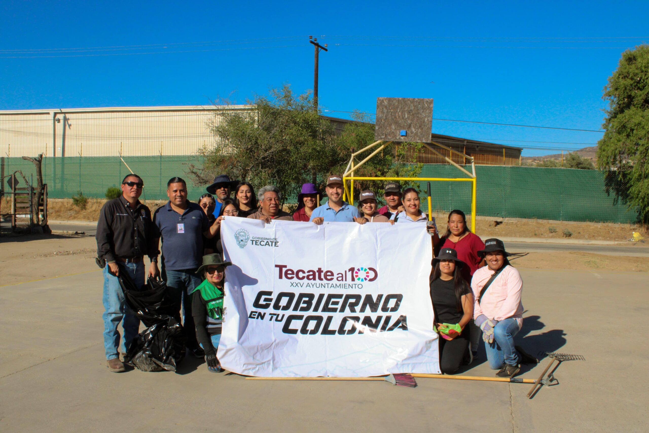 • Con el objetivo de recuperar espacios públicos y mejorar la calidad de vida de las familias tecatenses, esta tarde se llevó a cabo la jornada “Gobierno en tu Colonia” en la cancha de la colonia Maclovio Herrera, donde servidores públicos de todas las dependencias municipales unieron esfuerzos en labores de limpieza, rehabilitación y embellecimiento del entorno.