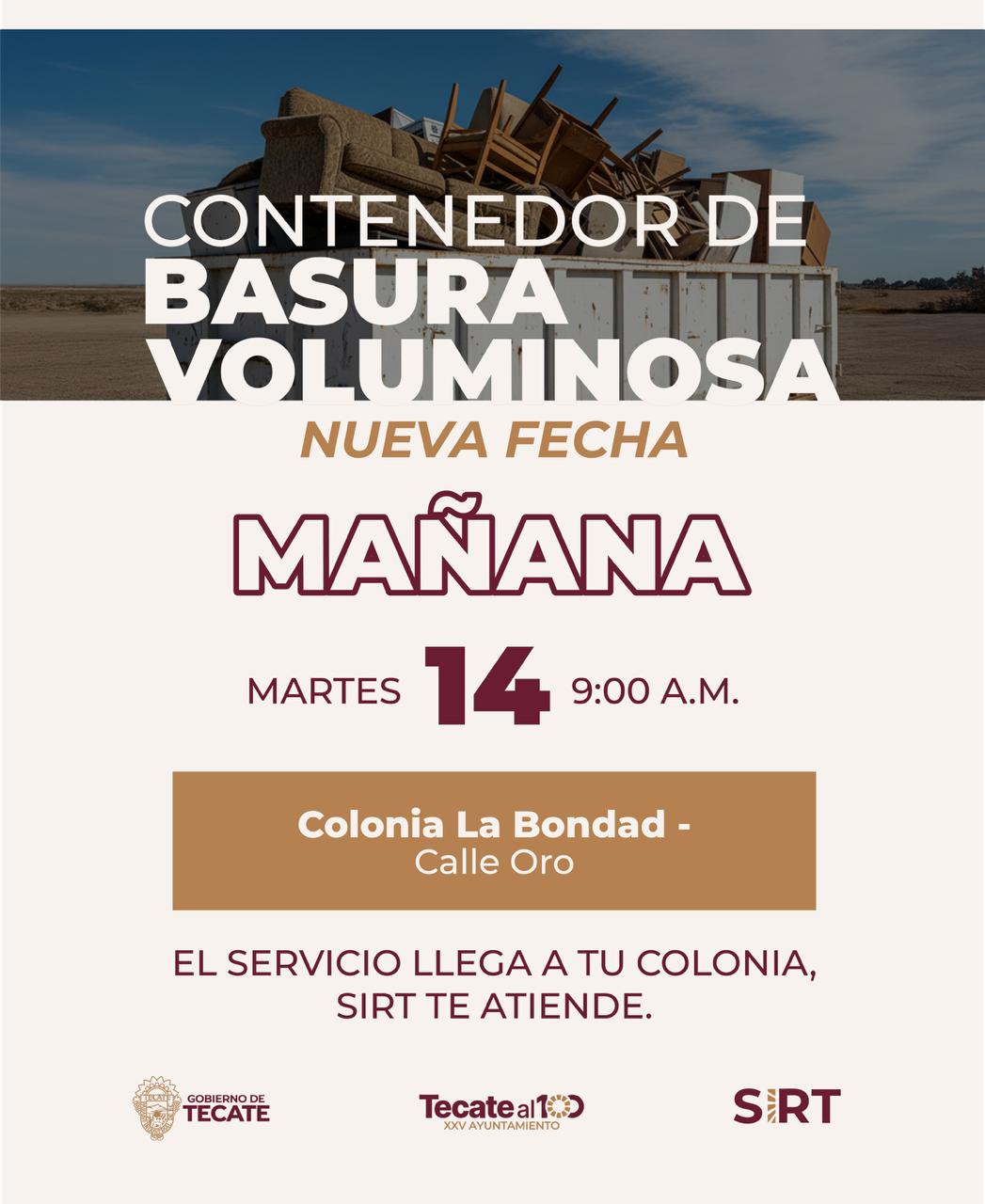 Como parte de la estrategia permanente para mantener un Tecate más limpio, ordenado y en mejores condiciones para todas las familias, el Gobierno de Tecate informa que este martes 14 de abril se instalará un contenedor para la recolección de basura voluminosa en la colonia La Bondad, sobre calle Oro.