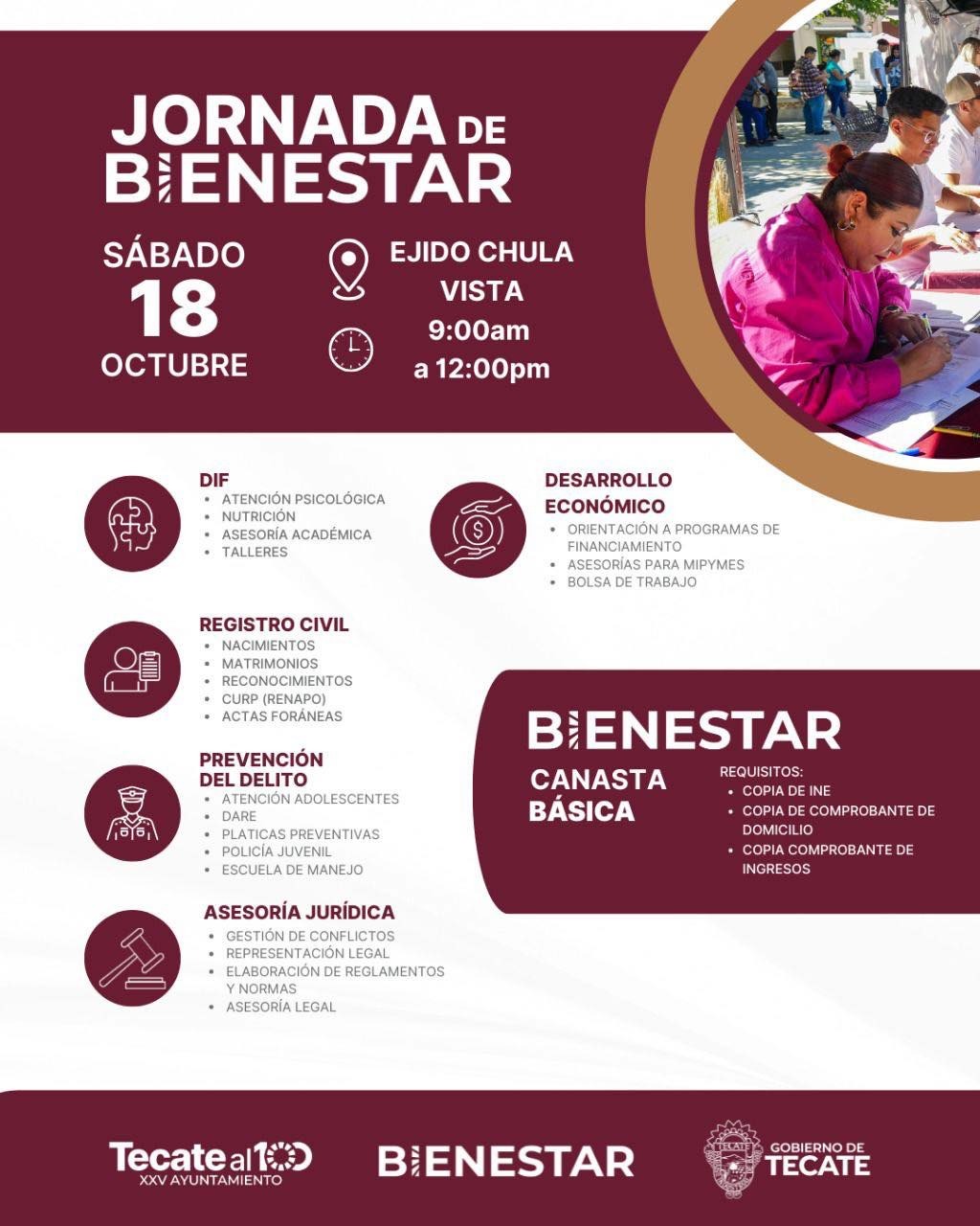 - Con el propósito de continuar acercando servicios esenciales y de calidad a las comunidades, el Gobierno de Tecate invita a la ciudadanía a participar en la próxima Jornada de Bienestar, que se llevará a cabo este sábado 18 de octubre en el Ejido Chula Vista, en un horario de 9:00 a.m. a 12:00 p.m.