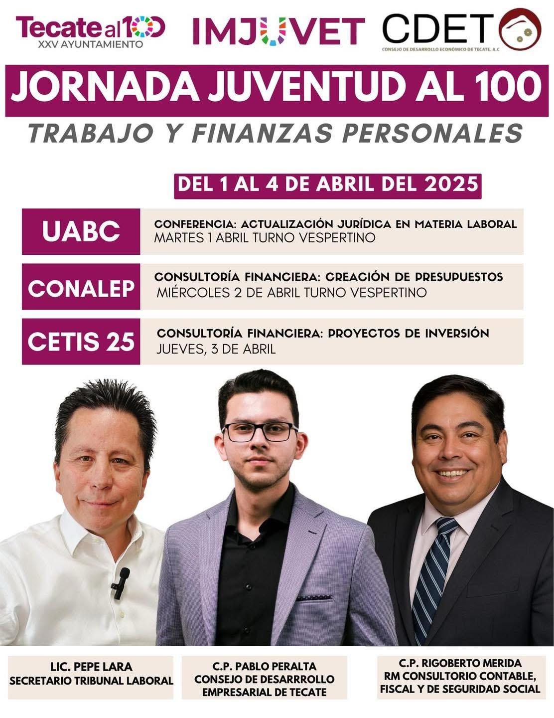 El Gobierno Municipal de Tecate, a través del Instituto Municipal de la Juventud (IMJUVET) y en colaboración con el Consejo de Desarrollo Económico de Tecate (CDET), ha puesto en marcha la Jornada Juventud al 100, un evento dirigido a jóvenes estudiantes con el objetivo de fortalecer sus conocimientos en materia laboral y financiera.