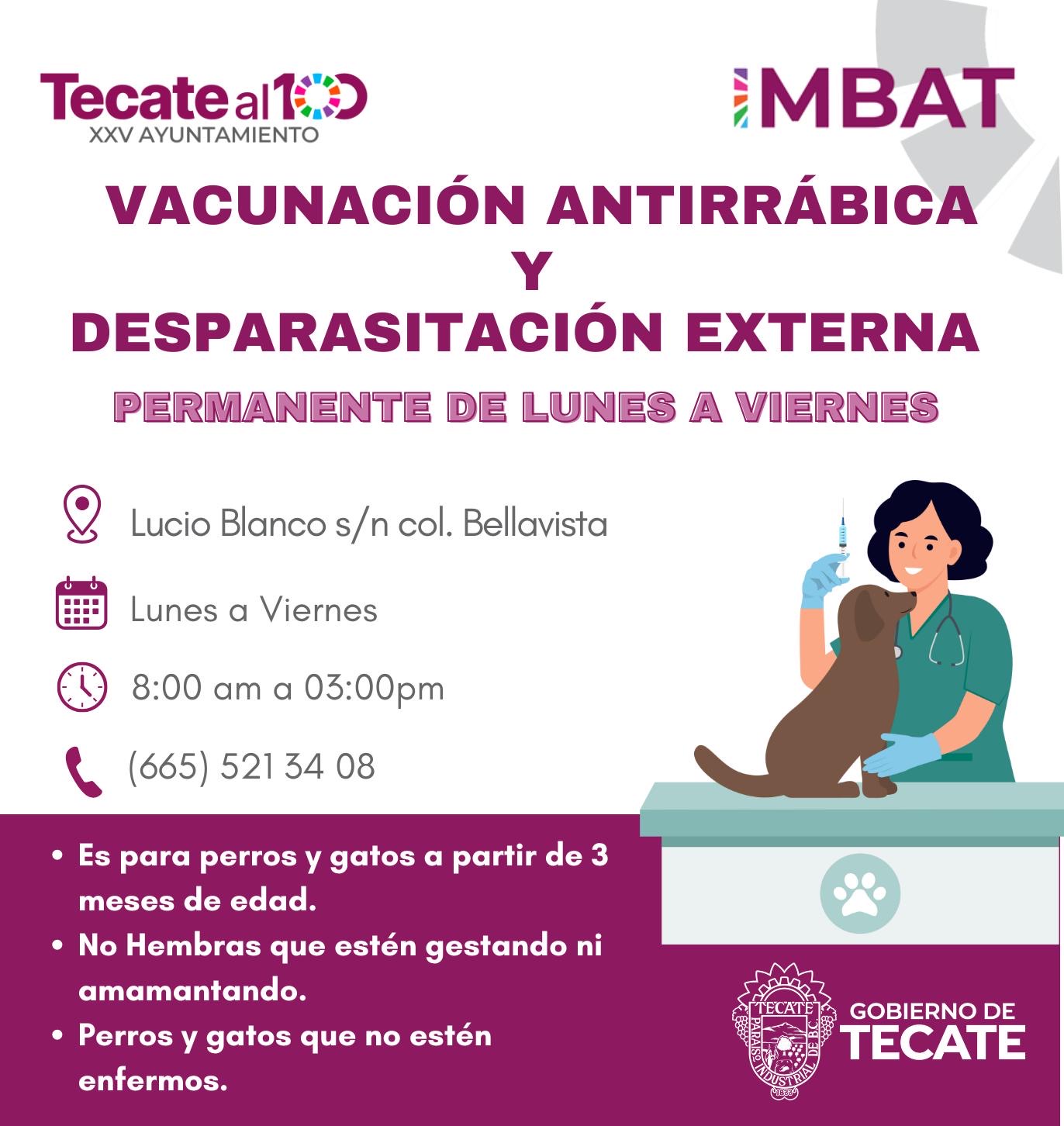 - En un esfuerzo continuo por proteger la salud pública y el bienestar animal, el Gobierno de Tecate, a través del Instituto Municipal de Bienestar Animal (IMBAT), informa a la ciudadanía que mantiene activa de manera permanente la campaña de vacunación antirrábica y desparasitación externa para perros y gatos.