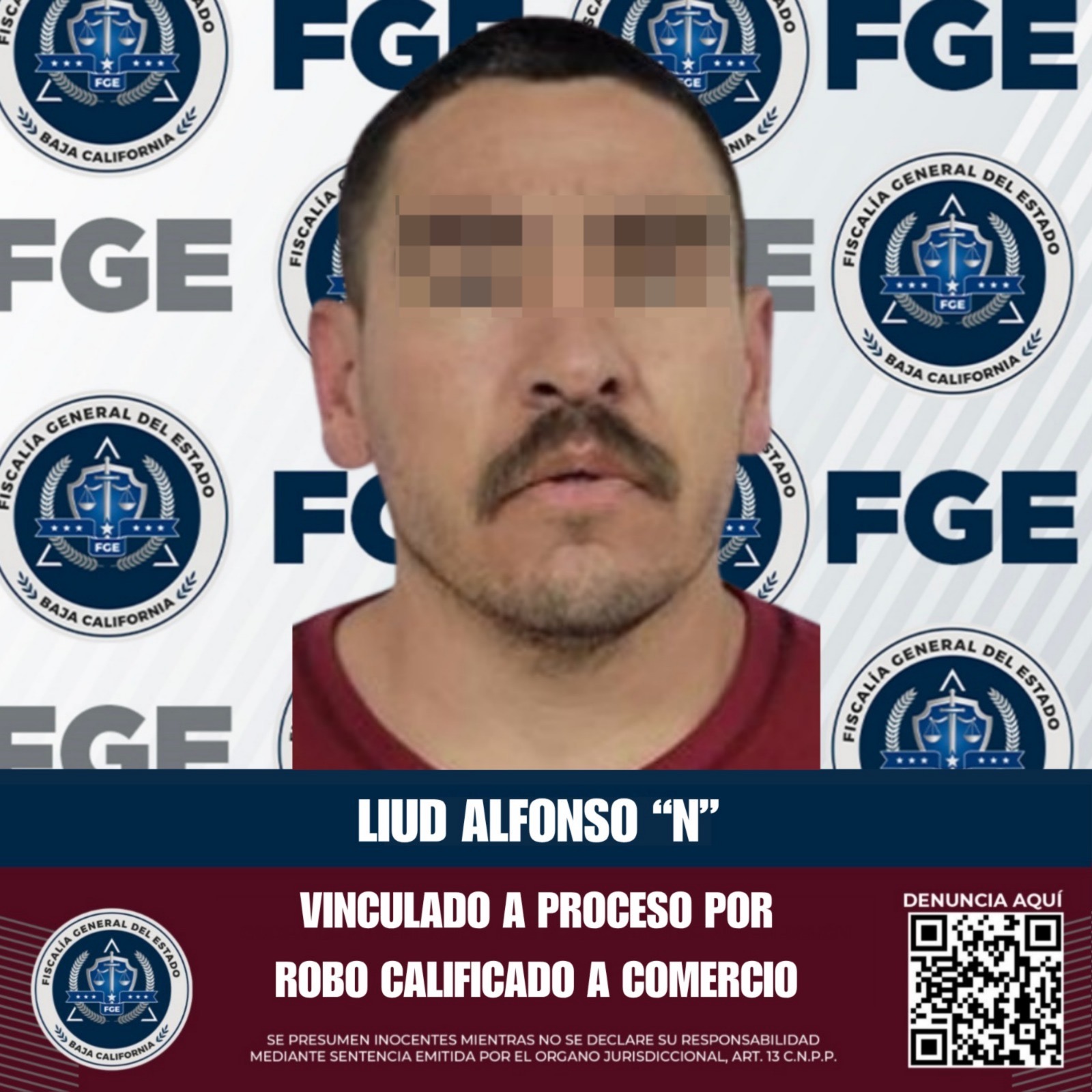 La Fiscalía Regional de Tecate, informa que se logró la vinculación a proceso en contra de Liud Alfonso “N”, por su probable participación en el delito de robo calificado cometido a establecimiento comercial abierto al público.