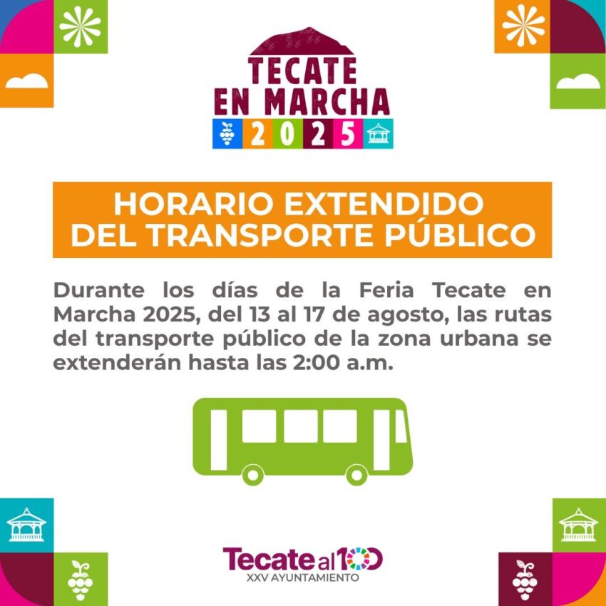• Pensando en el bienestar y comodidad de las familias tecatenses y de quienes visitan el municipio, el Gobierno de Tecate implementará un horario especial de transporte público durante la Feria Tecate en Marcha 2025, del 13 al 17 de agosto, para que nadie se quede sin disfrutar de esta gran celebración.