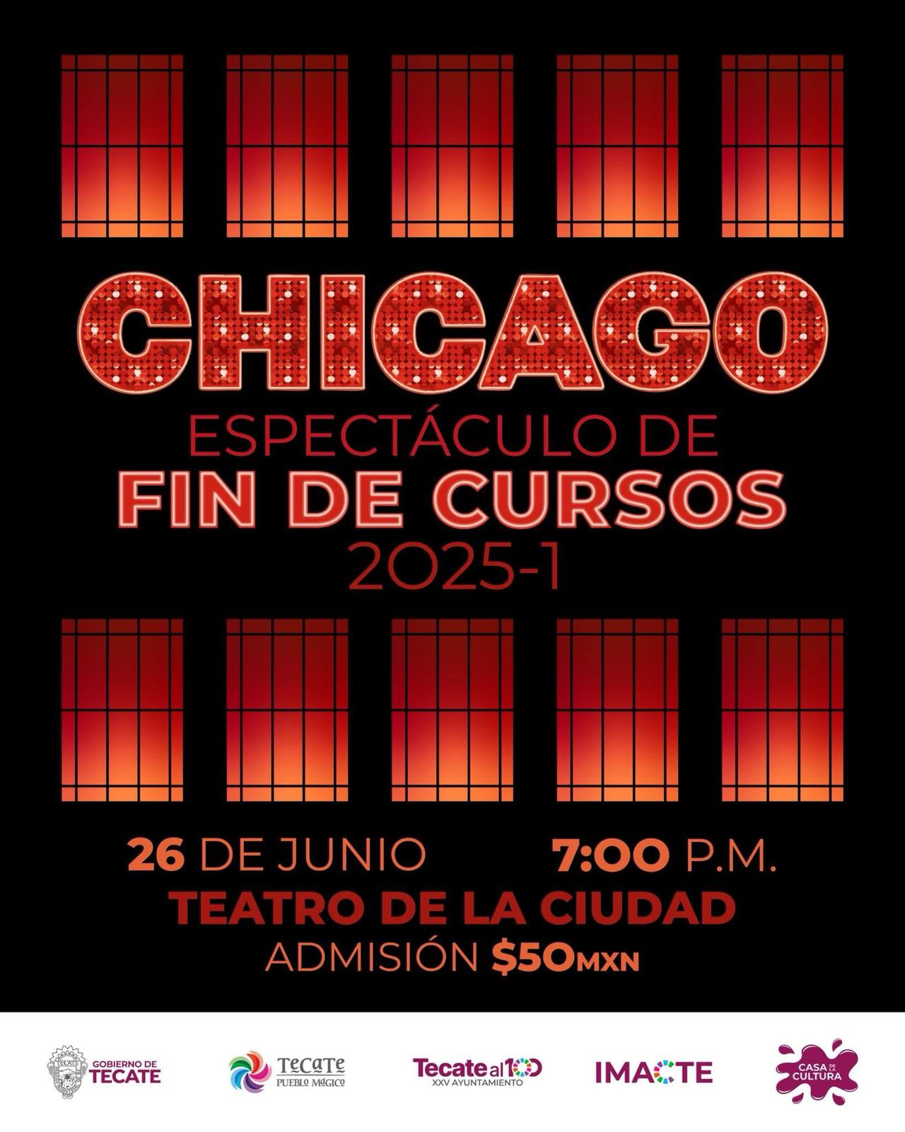 - El Gobierno de Tecate extiende una cordial invitación a la ciudadanía a presenciar el Espectáculo de Fin de Cursos 2025-1 del Instituto Municipal de Arte y Cultura de Tecate (IMACTE), titulado «Chicago», resultado del esfuerzo y dedicación de los alumnos y alumnas de las diversas disciplinas artísticas que se imparten en el Instituto.