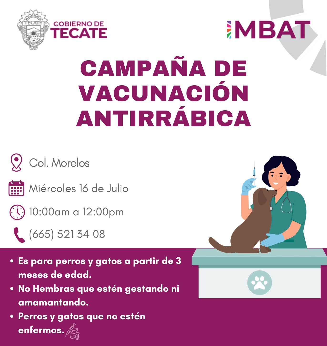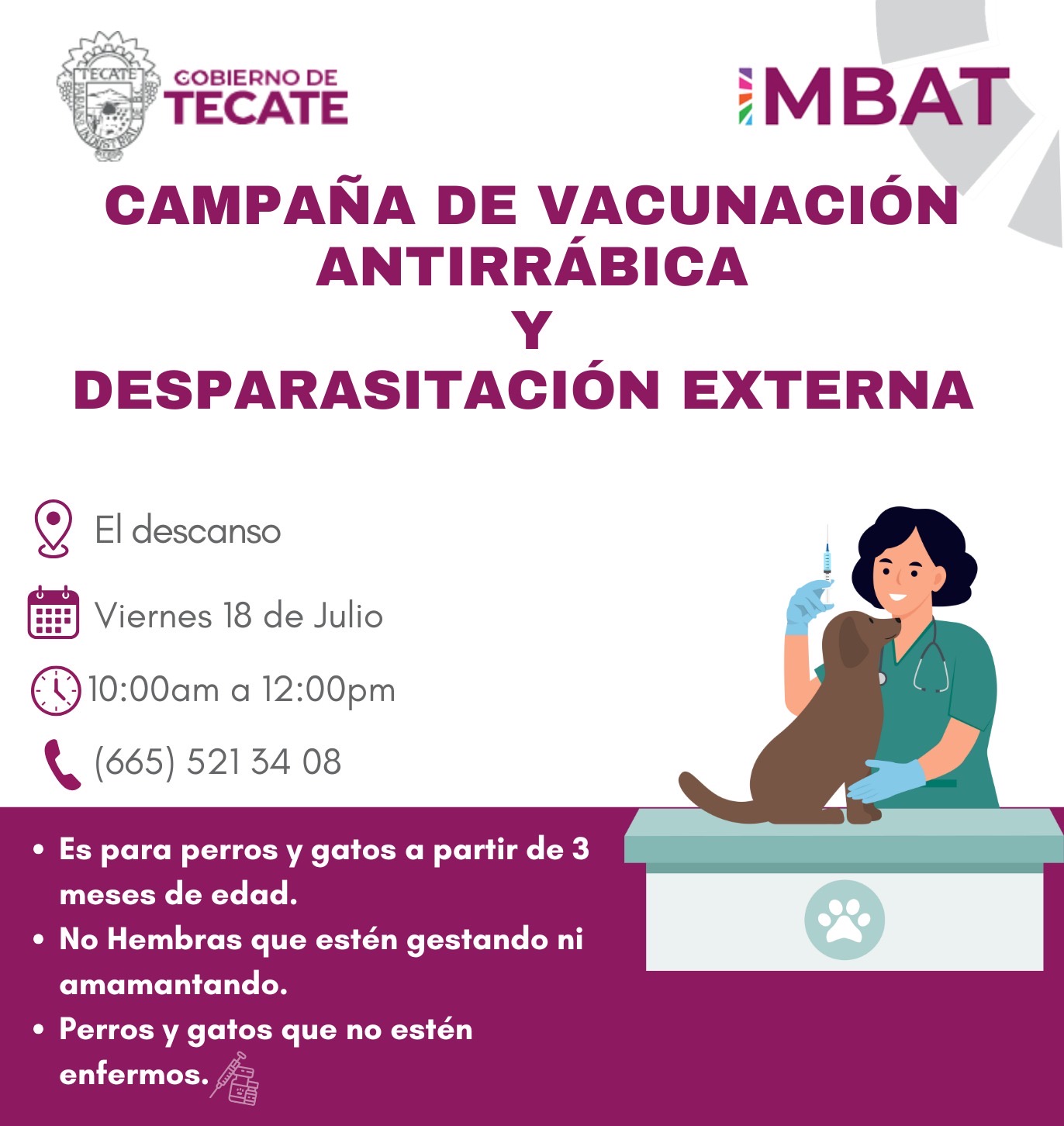 Como parte de las acciones para fortalecer la salud pública y el bienestar de las mascotas en el municipio, el Gobierno de Tecate, a través del Instituto Municipal de Bienestar Animal (IMBAT), continuará con la Campaña de Vacunación Antirrábica Gratuita en distintas colonias de la ciudad durante el mes de julio.