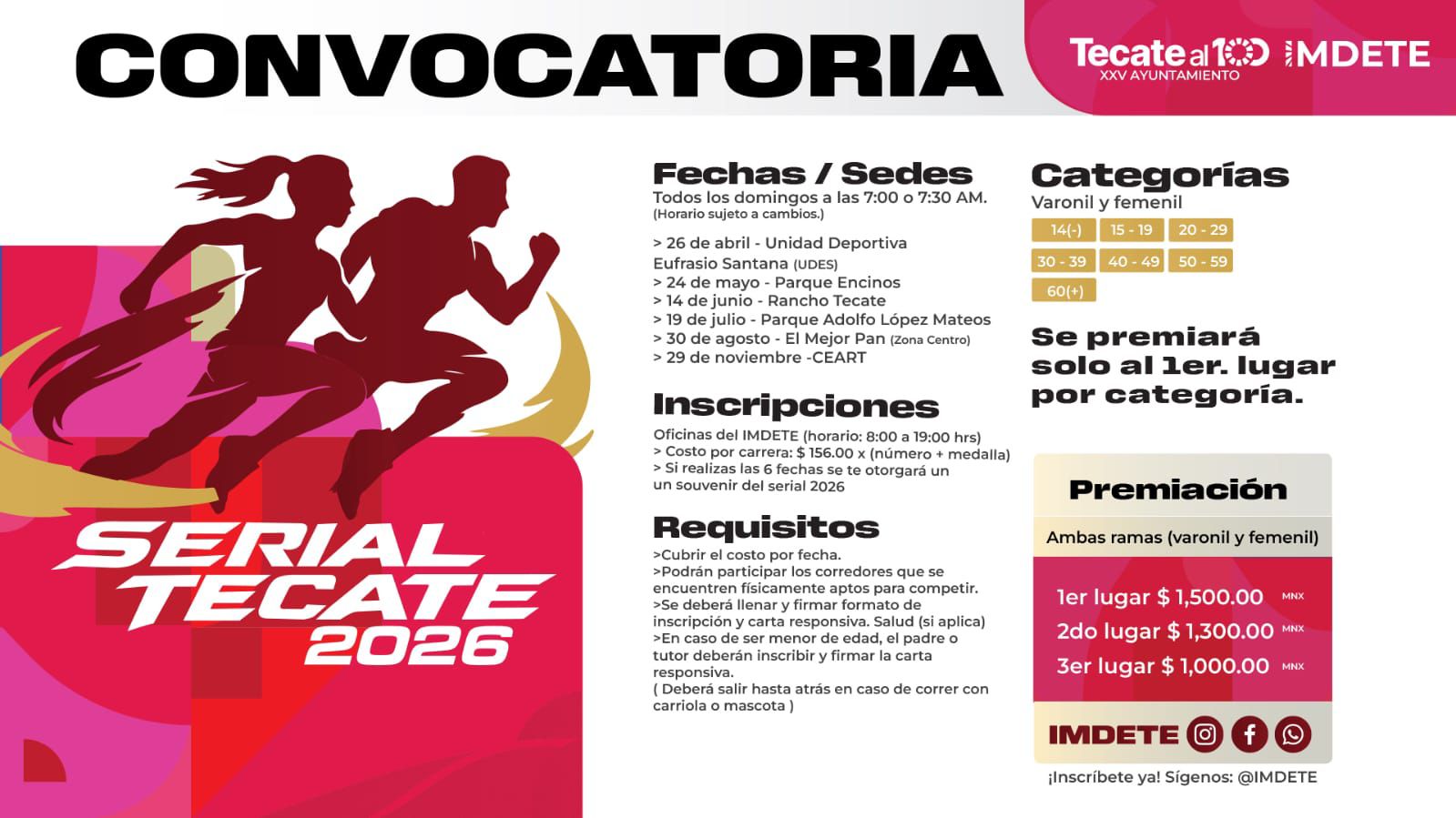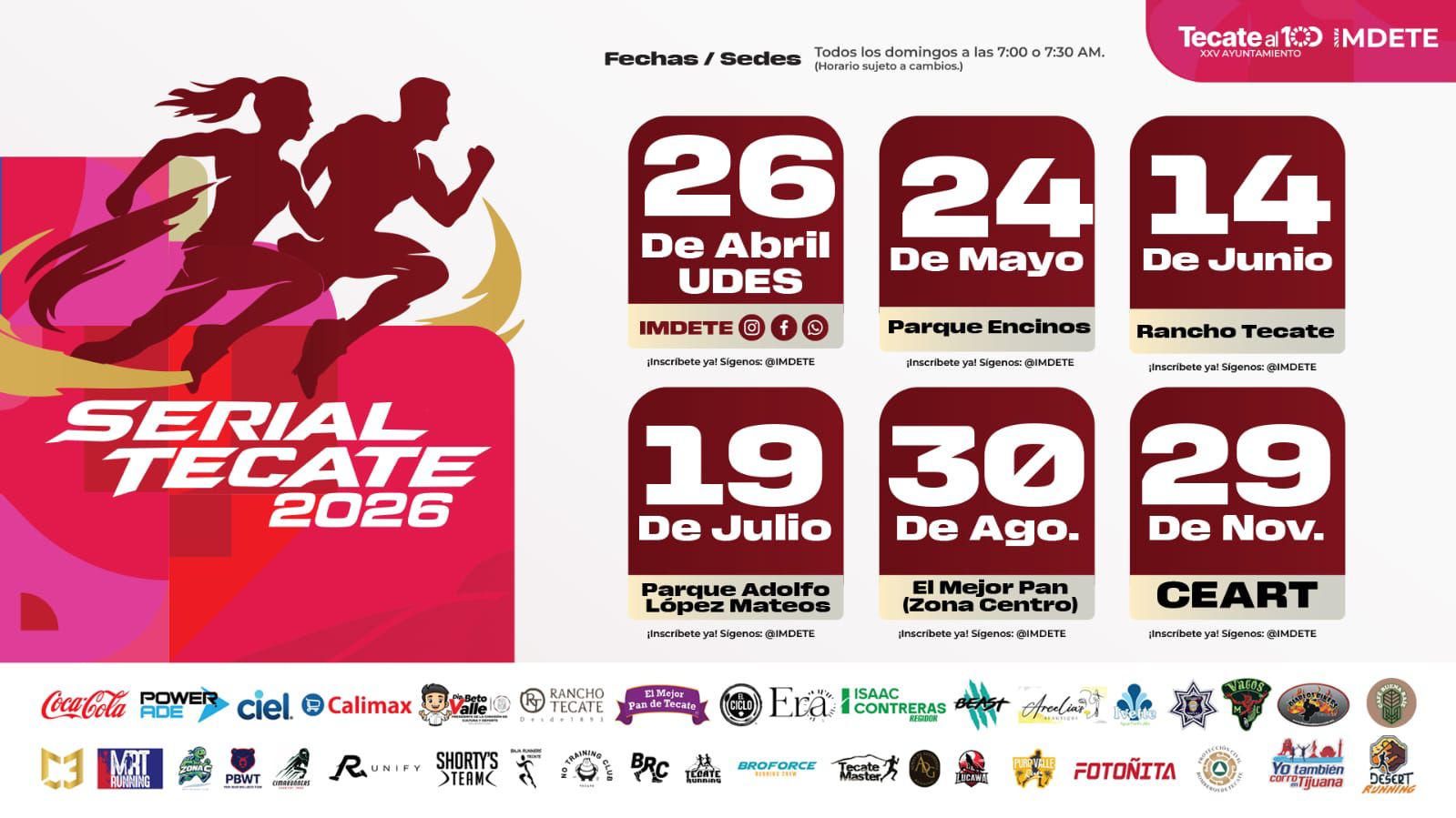 - Con el objetivo de fomentar la activación física, la convivencia familiar y el uso de los espacios públicos, el Instituto Municipal del Deporte de Tecate (IMDETE) anunció el arranque del Serial Atlético 2026, una serie de carreras que recorrerán distintos puntos emblemáticos del municipio a lo largo del año.