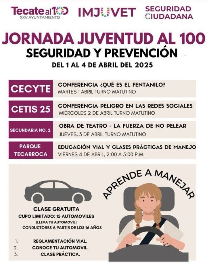 - Para fomentar la seguridad y prevención entre las juventudes, el Instituto Municipal de la Juventud (IMJUVET) en colaboración con la Dirección de Seguridad Ciudadana, llevará a cabo la “Jornada Juventud al 100” del 1 al 4 de abril de 2025.