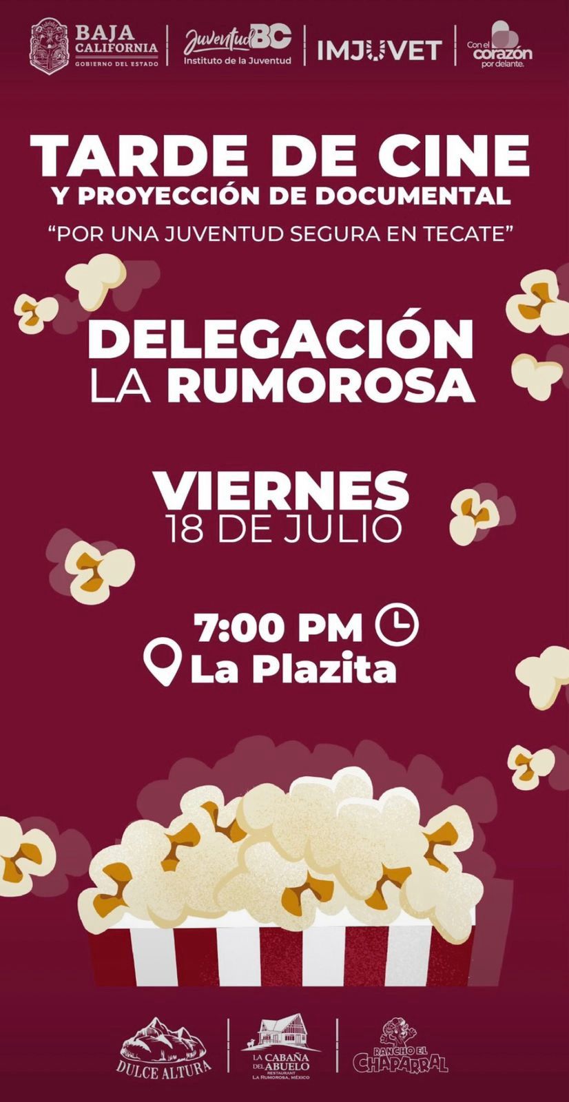 • Como parte de la estrategia integral para la prevención del delito y el fortalecimiento de entornos seguros para las juventudes, el Instituto Municipal de la Juventud de Tecate (IMJUVET) realizará el estreno de un documental con enfoque social, este viernes 18 de julio a las 7:00 p.m. en La Plazita, en la Delegación La Rumorosa.