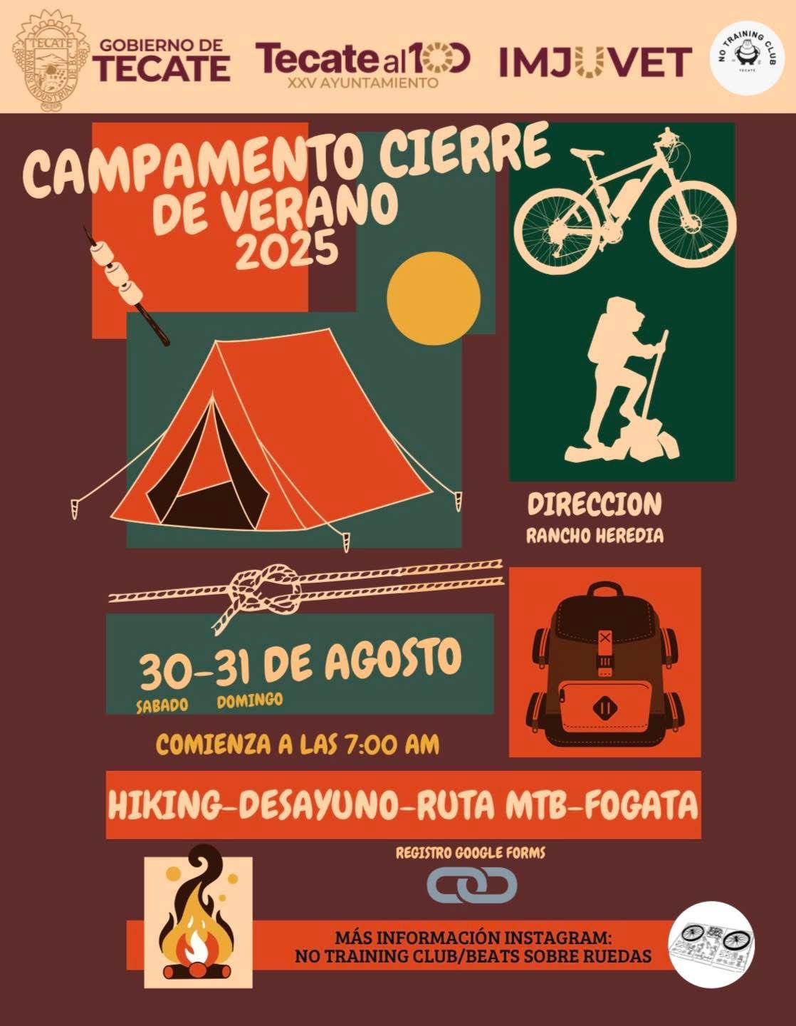 - Con la finalidad de ofrecer a la juventud tecatense espacios de recreación, esparcimiento y sano desarrollo, el Instituto Municipal de la Juventud de Tecate (IMJUVET), en colaboración con No Training Club, llevará a cabo el Campamento Cierre de Verano 2025 este sábado 30 y domingo 31 de agosto en el Rancho Heredia.