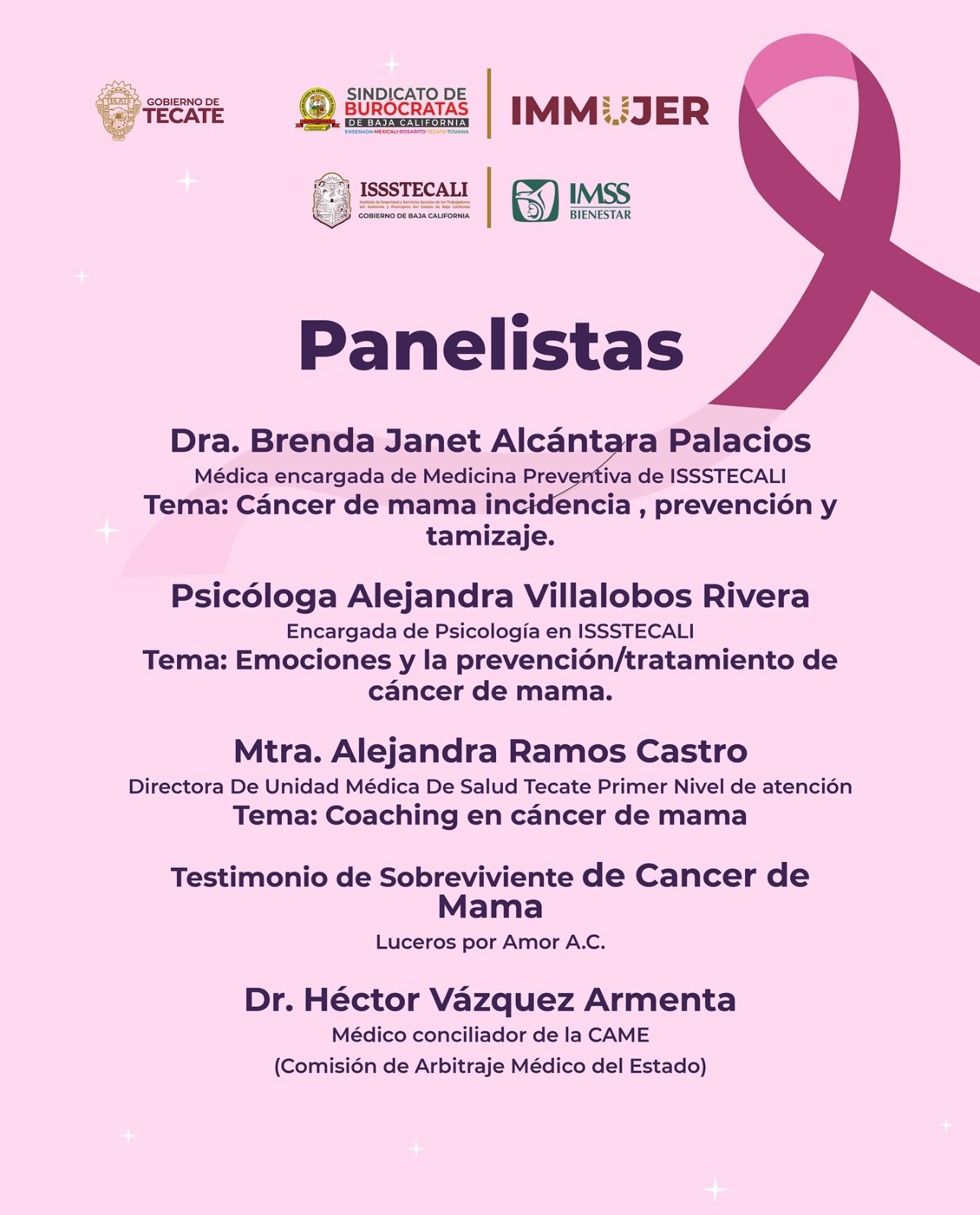 El evento contará con un panel de especialistas que abordarán la enfermedad desde perspectivas médicas, psicológicas y de experiencia personal, entre ellas la Dra. Brenda Janet Alcántara Palacios, Médica encargada de Medicina Preventiva de ISSSTECALI, quien presentará el tema «Cáncer de mama: incidencia, prevención y tamizaje», brindando información esencial sobre las estadísticas y los métodos de detección.