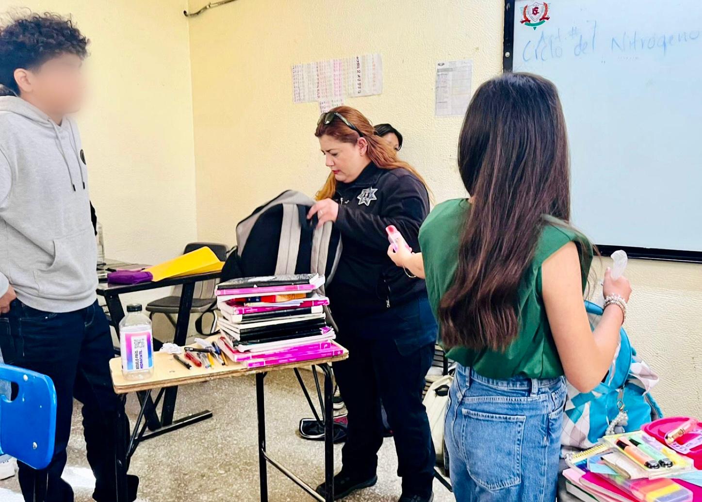 Este martes, personal especializado de la DSCTM llevó a cabo una revisión aleatoria de pertenencias en la Escuela Secundaria No. 1 Francisco I. Madero, turno vespertino, en atención a la solicitud del personal directivo del plantel. El objetivo fue prevenir el ingreso de objetos prohibidos como vapeadores (vapes), armas punzocortantes, o cualquier otro artículo que pueda poner en riesgo la integridad física, emocional o psicológica de las y los alumnos, el personal docente o las instalaciones escolares.