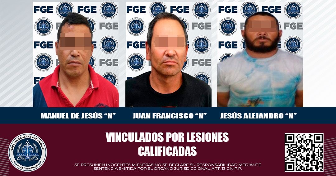 La Fiscalía Regional de Mexicali, a través de la Unidad de Investigación con Detenidos Poniente, obtuvo la vinculación a proceso de tres hombres presuntamente implicados en delitos de lesiones calificadas, luego de presentar elementos de prueba contundentes.