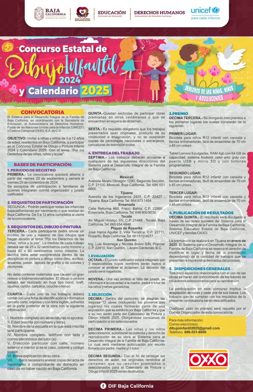 Inició el pasado 20 de septiembre la convocatoria y recepción de trabajos para el Concurso Estatal de Dibujo y Pintura Infantil 2024 y Calendario 2025 bajo el tema “Por los Derechos de las niñas, niños y la paz” convocado por el Sistema DIF Baja California, la Secretaria de Educación, UNICEF y la Cadena Comercial OXXO.
