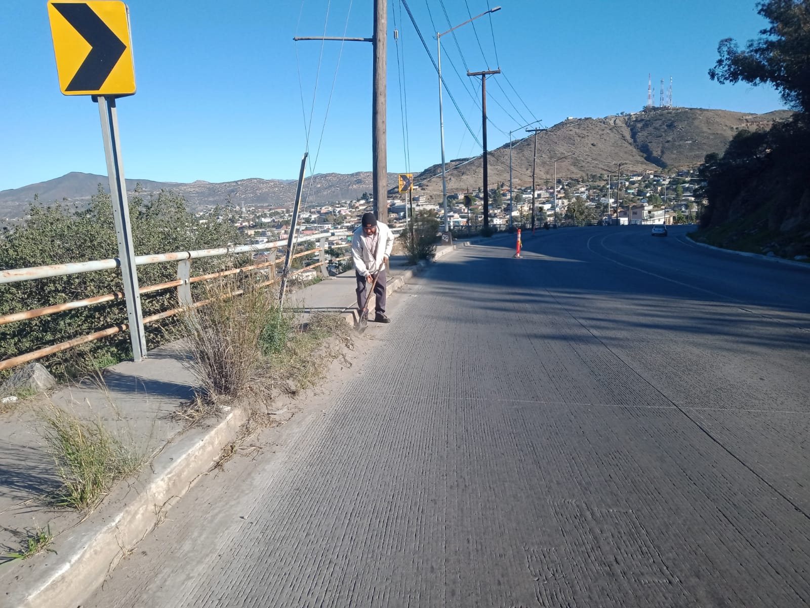 De igual manera, se efectuaron trabajos de limpieza de cordones y banquetas en la salida Tecate–Ensenada, sobre el Boulevard Universidad, con el fin de mantener espacios públicos limpios y ordenados.