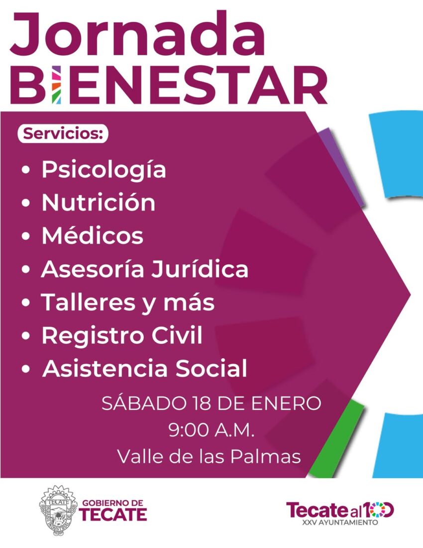 - El Gobierno Municipal de Tecate, encabezado por el alcalde Román Cota Muñoz, invita a toda la comunidad a participar en la Jornada de Bienestar, que se realizará este sábado 18 de enero en la Unidad Deportiva de la Delegación Valle de las Palmas, en un horario de 9:00 a.m. a 12:00 p.m.