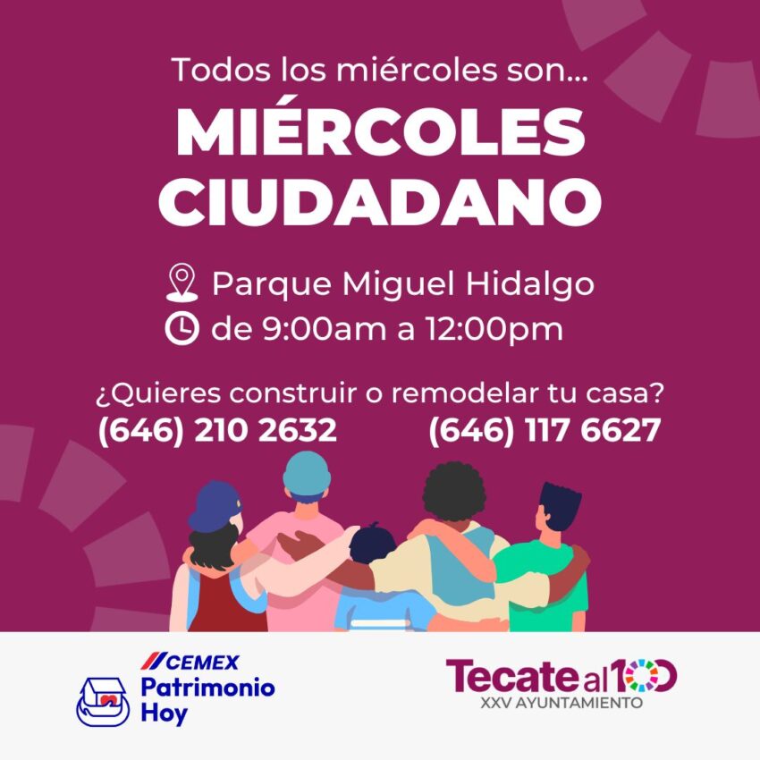• Los miércoles ciudadanos son un espacio para resolver dudas, recibir orientación y gestionar trámites directamente con las dependencias municipales, gracias a la alianza entre el Gobierno de Tecate y CEMEX, se contará con la presencia de un módulo especial con el programa “Patrimonio hoy” para mejorar los hogares tecatenses.