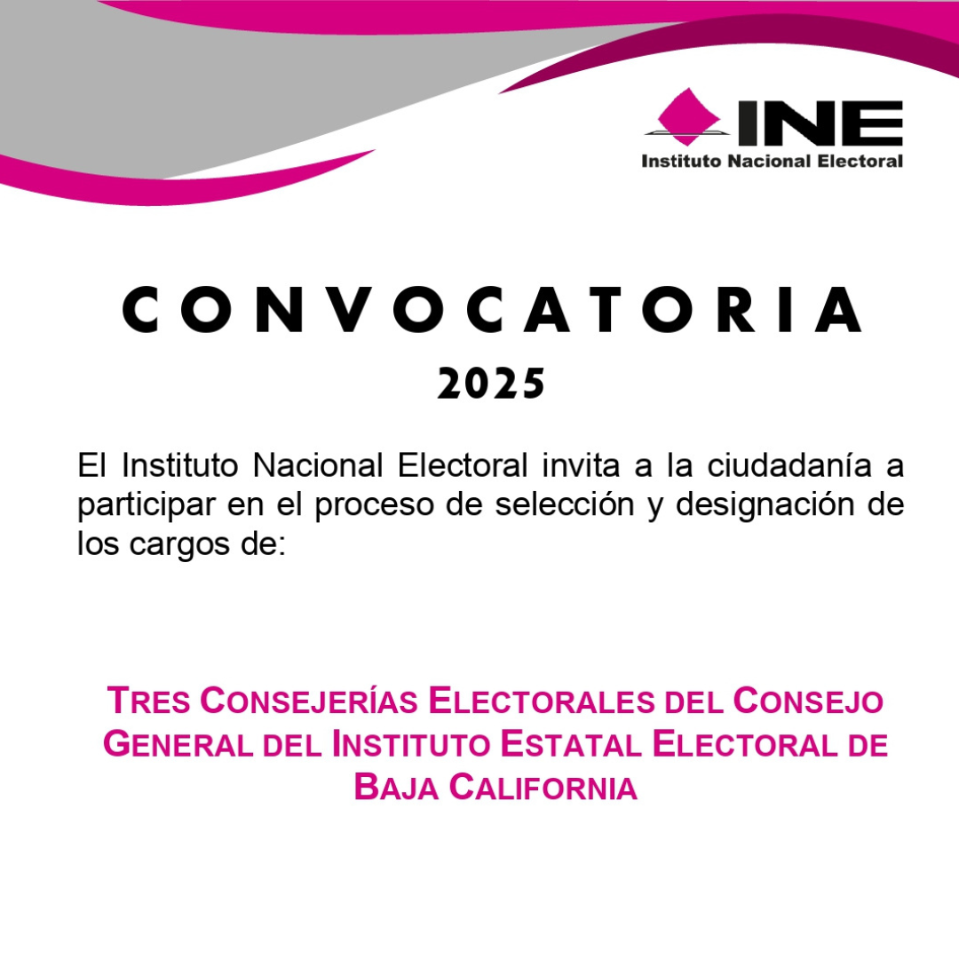 El Instituto Nacional Electoral en Baja California (INE BC) hace una atenta invitación a la ciudadanía que esté interesada en participar en la Convocatoria para el proceso de selección que tiene como propósito designar tres Consejerías Electorales para integrar el Consejo General del Instituto Estatal Electoral de Baja California (IEEBC), quienes ocuparán el cargo por un periodo de siete años, a partir del 1 de noviembre de 2025.