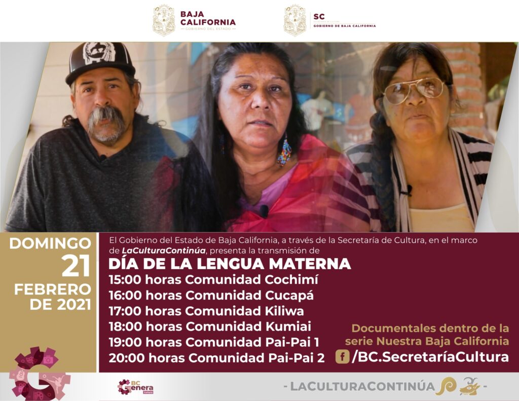 La Secretaría de Cultura de Baja California suma a su programación virtual la proyección de videos que documentan expresiones de las comunidades Cochimí, Cucapá, Kiliwa y Kumiai, de la serie Nuestra Baja California, en el marco de las celebraciones por el Día Internacional de la Lengua Materna este 21 de febrero.