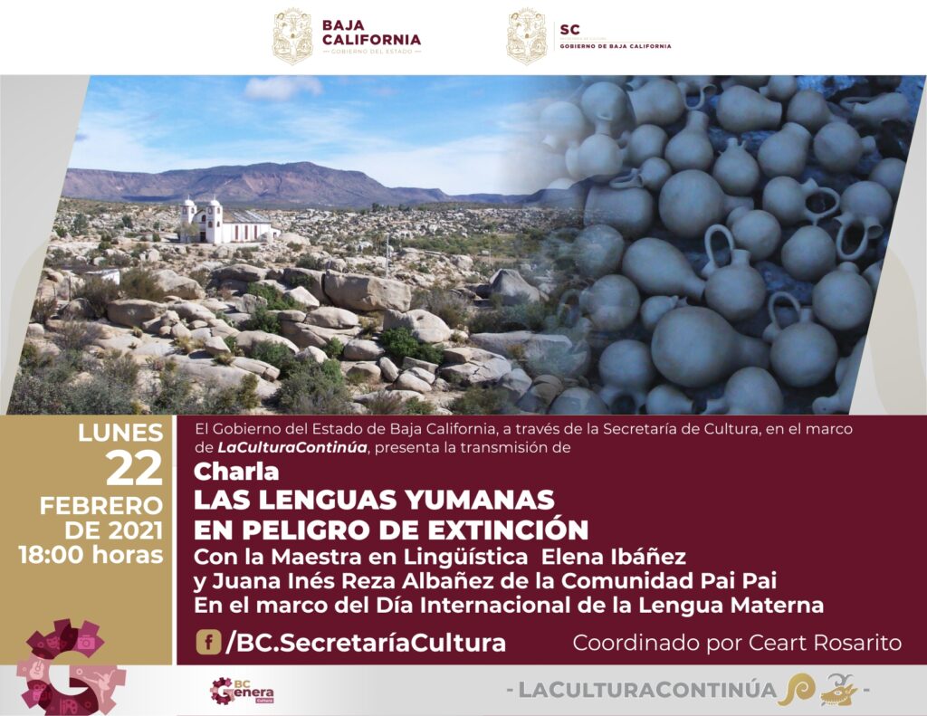 Además de esta serie de documentales, se proyectará el lunes 22 de febrero a las 18:00 horas la charla Las lenguas yumanas en peligro de extinción, con Elena Ibáñez y Juana Inés Reza Albáñez. Todo desde la página de Facebook @BC.SecretariaCultura.