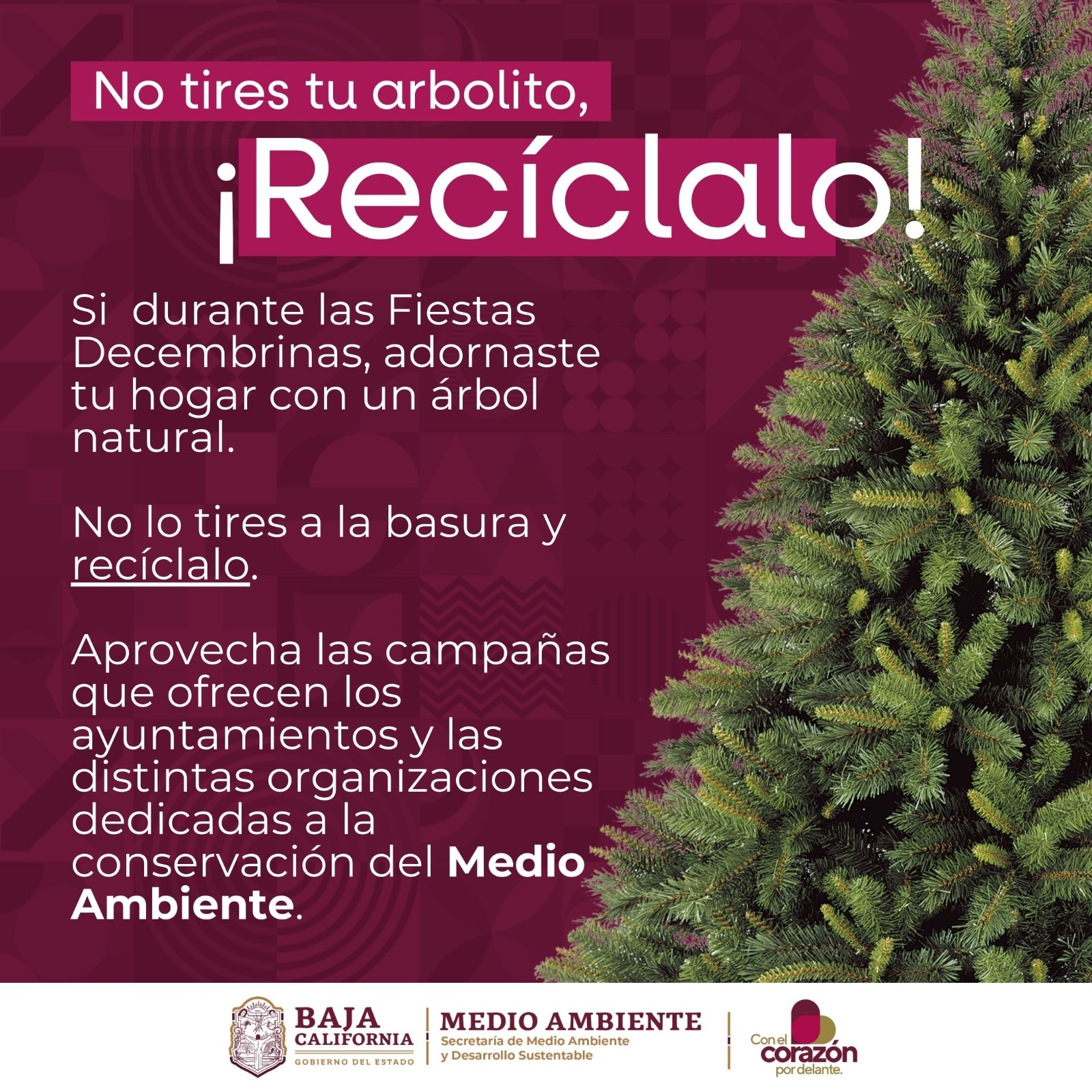 La Secretaría de Medio Ambiente y Desarrollo Sustentable (SMADS) invita a la ciudadanía a participar activamente en las campañas de reciclaje de árboles de Navidad, como una acción responsable para el cuidado del entorno y el manejo sustentable de los desechos domésticos.
