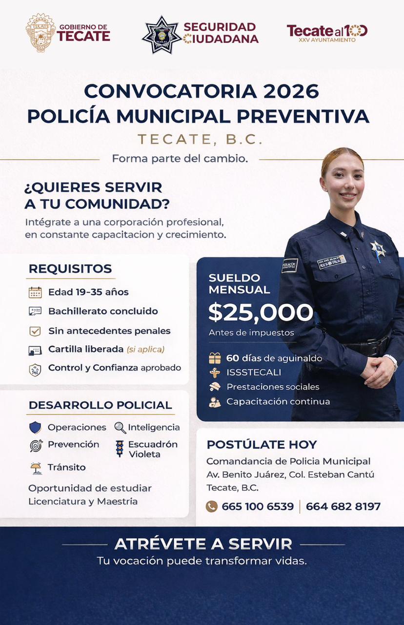 La Dirección de Seguridad Ciudadana reitera la invitación a quienes deseen hacer la diferencia y contribuir activamente al bienestar de Tecate, formando parte de una nueva generación de policías comprometidos con servir y proteger.
