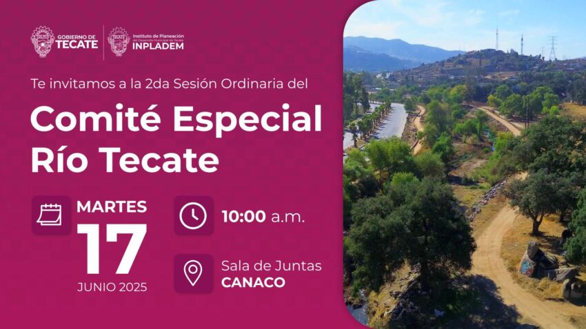 - El Gobierno de Tecate, a través del Instituto de Planeación del Desarrollo Municipal (INPLADEM), extiende una cordial invitación a la ciudadanía, representantes de organismos públicos y privados, así como a la sociedad civil, a participar en la 2da Sesión del Comité Especial Río Tecate.