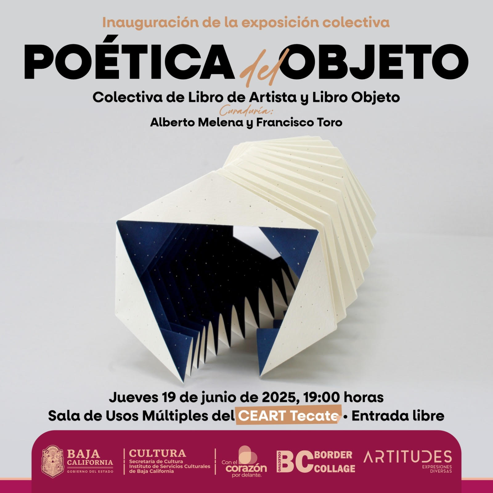 Con el objetivo de visibilizar el collage y otras prácticas artísticas, se busca reunir la obra plástica y visual de artistas de la región, a través de la exposición ¨Poética del objeto- Muestra colectiva de libro de artista y libro objeto¨ organizado por Border Collage en la que reúne artistas de Baja California este próximo jueves 19 de junio dentro de la Sala de Usos Múltiples del Centro Estatal de las Artes Tecate en punto de las 7:00 pm con entrada gratuita.