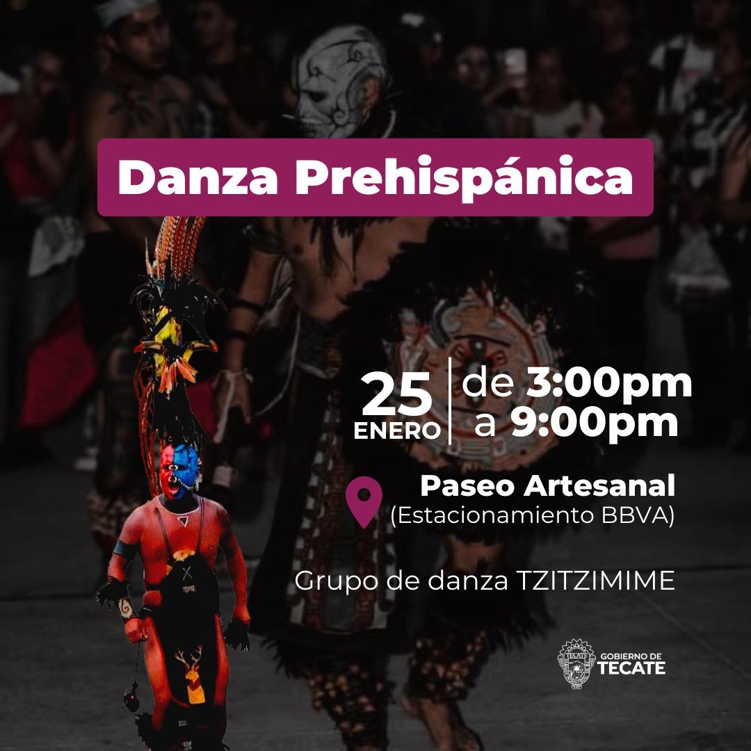 El Gobierno de Tecate, y los distintos grupos de Artesanos y Comerciantes de Artesanías en Tecate, Baja California, invitan a la presentación de Danza Prehispánica, a cargo de la agrupación Danza Tzitzimime.