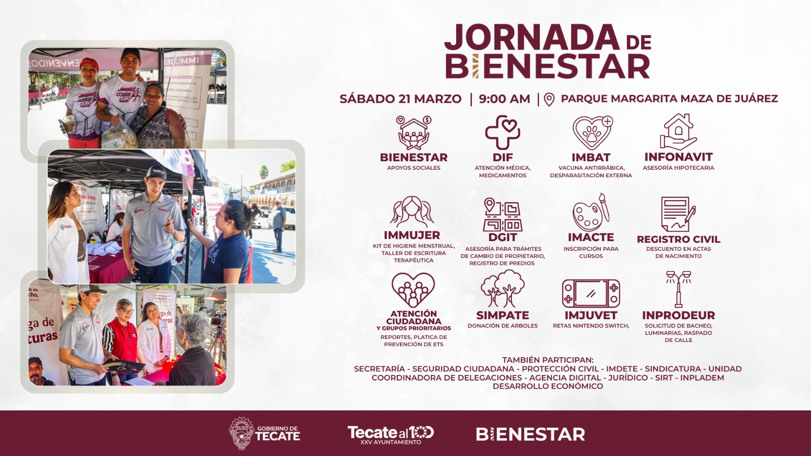 Con el firme compromiso de seguir acercando servicios y soluciones a la comunidad, el Gobierno de Tecate llevará a cabo una nueva Jornada de Bienestar este sábado 21 de marzo a las 9:00 de la mañana en el Parque Margarita Maza de Juárez, consolidando un espacio de atención directa para las familias.