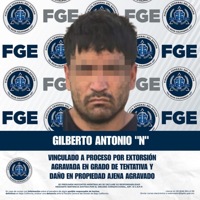 La Fiscalía Regional de Playas de Rosarito, a través de la Coordinación de la Unidad de Investigación Especializada en Delitos Patrimoniales, informa que se logró obtener prisión preventiva justificada en contra de Gilberto Antonio “N”, por su probable responsabilidad en los delitos de extorsión agravada en grado de tentativa y daño en propiedad ajena agravado.