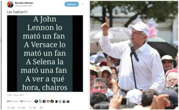 El fin de semana, Ricardo Alemán tuiteó: “Les hablan!!!”, y adjuntó una imagen con la leyenda: “A John Lennon lo mató un fan. A Versace lo mató un fan. A Selena la mató un fan. A ver a qué hora, chairos”.
