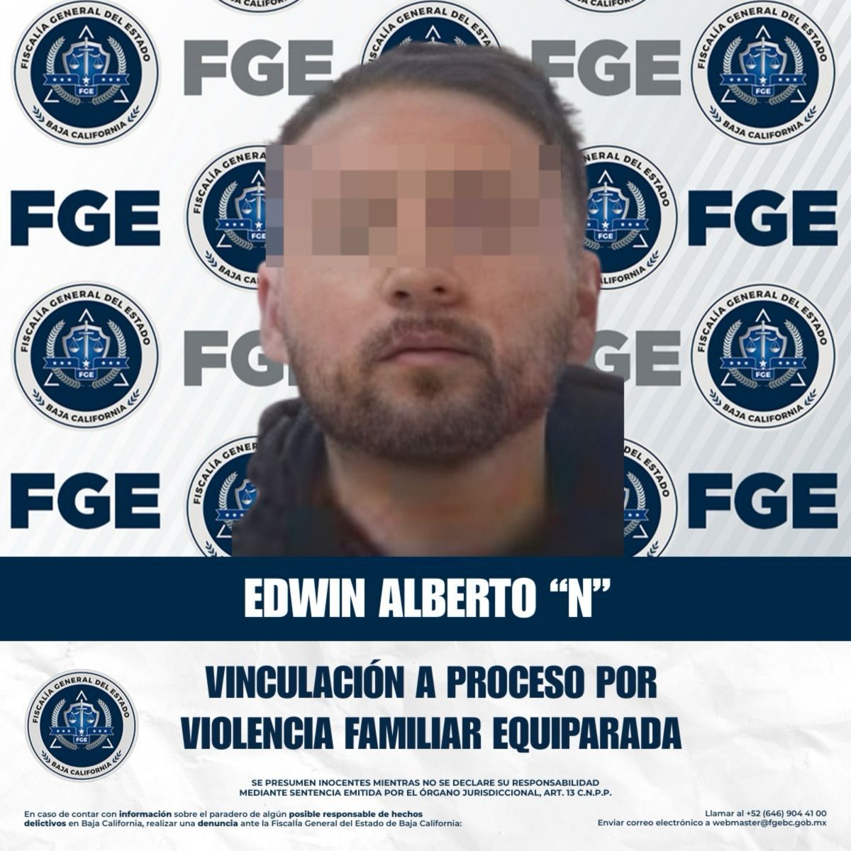 - La Fiscalía Regional de Tecate, a través de la Unidad de Investigación con Detenido, obtuvo la vinculación a proceso de Edwin Alberto “N”, por su presunta responsabilidad en el delito de violencia familiar equiparada.
