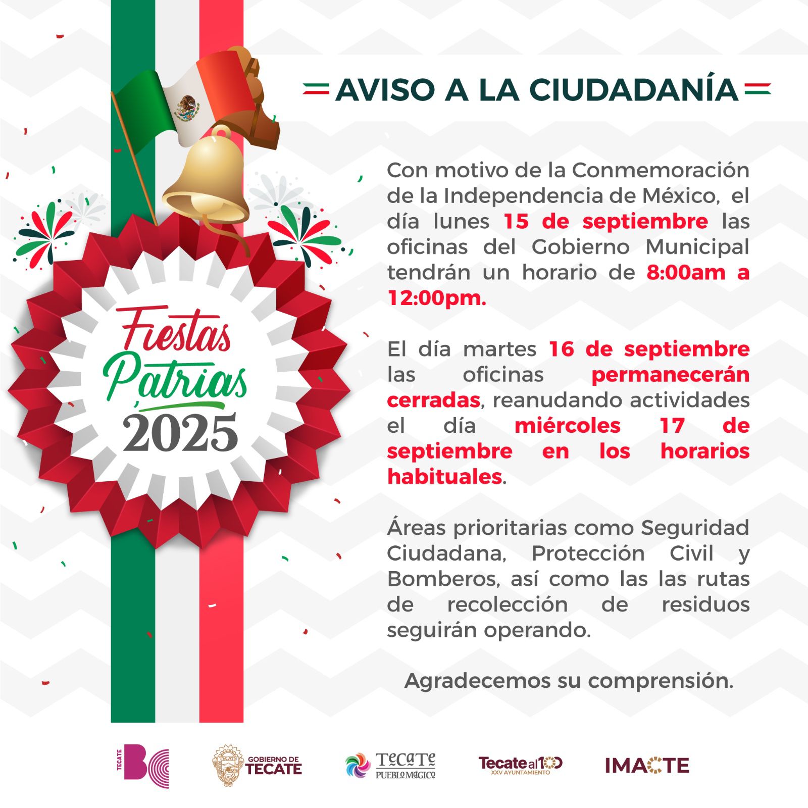 Oficinas del Gobierno de Tecate estarán cerradas el 16 de Septiembre