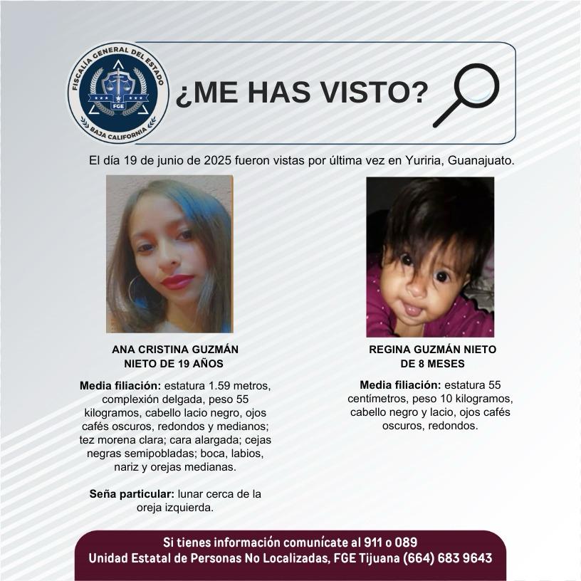 - La Fiscalía General del Estado (FGE) solicita el apoyo de la ciudadanía para localizar a Ana Cristina Guzmán Nieto, de 19 años, y a Regina Guzmán Nieto, de 8 meses.
