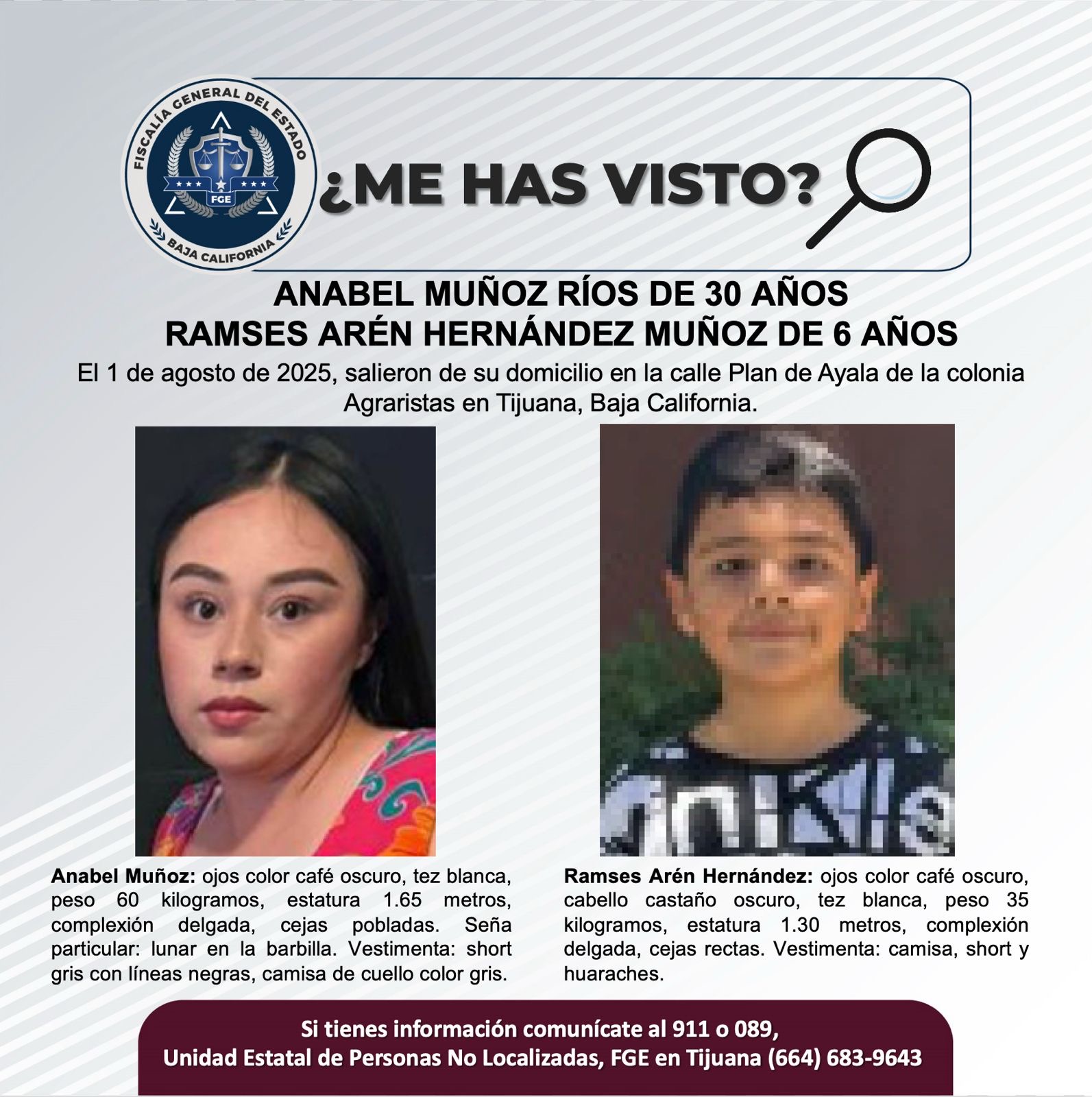 - La Fiscalía General del Estado (FGE), solicita el apoyo de la ciudadanía para localizar a Anabel Muñoz Ríos de 30 años y Ramses Arén Hernández Muñoz de 6 años de edad.