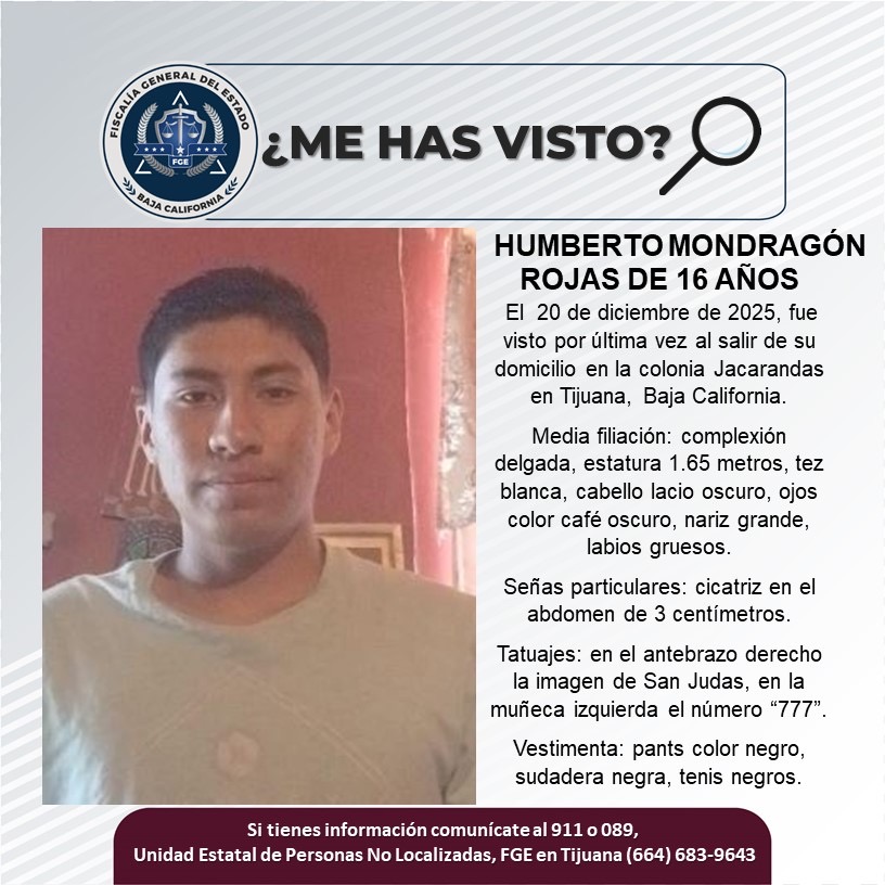 - La Fiscalía General del Estado (FGE), solicita el apoyo de la ciudadanía para localizar Humberto Mondragón Rojas de 16 años de edad.