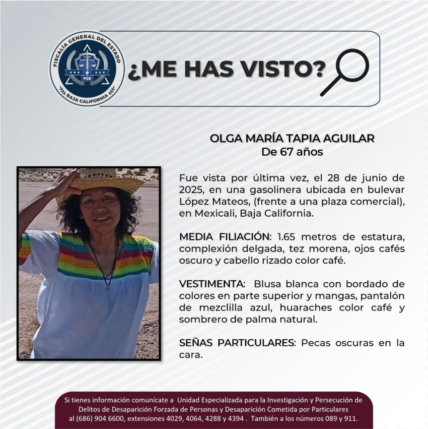 - La Fiscalía General del Estado, a través de la Unidad para la Investigación y Persecución de Delitos de Desaparición Forzadas de Personas y Desaparición Forzada cometida por Particulares, solicita la colaboración de los ciudadanos para localizar a Olga María Tapia Aguilar 67 años.